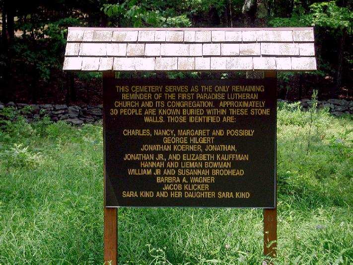 Beginning in 1827 the baptism records of the children of John and Elizabeth Boorem begin appearing in the records of the Evangelical Lutheran Church in Paradise Valley. Again, this is important because it establishes the family in Paradise Valley prior to 1830. The church, the very first in the valley, was founded two years earlier in 1825, and people traveled from miles around to attend. Six of John and Elizabeth's children were baptized at the church, beginning with Eleanor in 1827. The church remained an active, vital part of the community until 1856. Today all that remains of this early church is its overgrown graveyard and a few barely legible stones (some in German) precariously protected by a low stone fence. A cornerstone at the entrance to the cemetery is etched with the date 1825, the year the church was founded.Directions to the cemetery