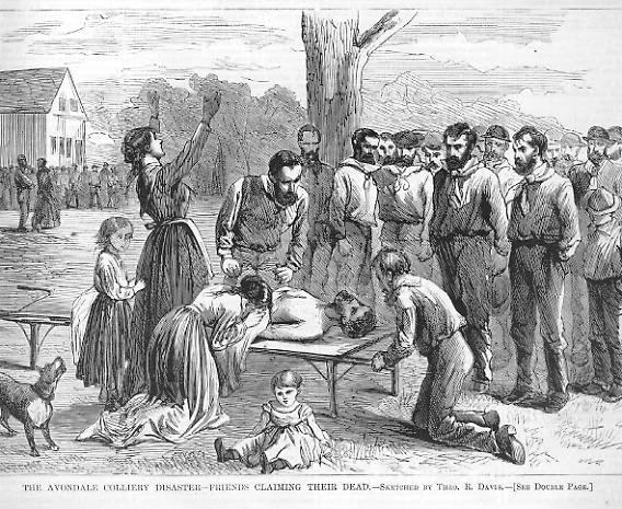 Below you will find a transcription of a research paper written by James M. Corrigary regarding the Avondale Mine Disaster (Plymouth, Luzerne Co., Pa.) of 6 Sept 1869, an accident that claimed the lives of 110 men and boys, miners and mine laborers. The report is found at the Mine Safety and Health Administration Library in Denver, Colorado, and provides fascinating eyewitness accounts of the accident and its aftermath, along with testimony from the official inquest. At times the eyewitness accounts are heart-wrenching and gruesome, particularly when the corner describes the condition of the bodies as they were recovered from the mine. The testimony at the official inquest into the accident makes for compelling reading as well, as witness made varying statements regarding the safety of the mine, and the precautions taken to prevent just such a disaster. Due to its length, I have broken the paper into five parts contained on five separate pages. There is a sixth page featuring illustrations of the Avondale Disaster and it's aftermath, from the September 24, 1869 issue of Harper's Weekly. I have also used these drawings throughout the other five pages to better illustrate the story of the disaster.
