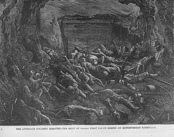 - Dennis Guyton, of Avondale; horrid object; face bloody and frightful; held tobacco pipe in left hand; both arms stiff above his head and all black with smoke and dirt. He laid in the mine with his face down. Wife and seven children.