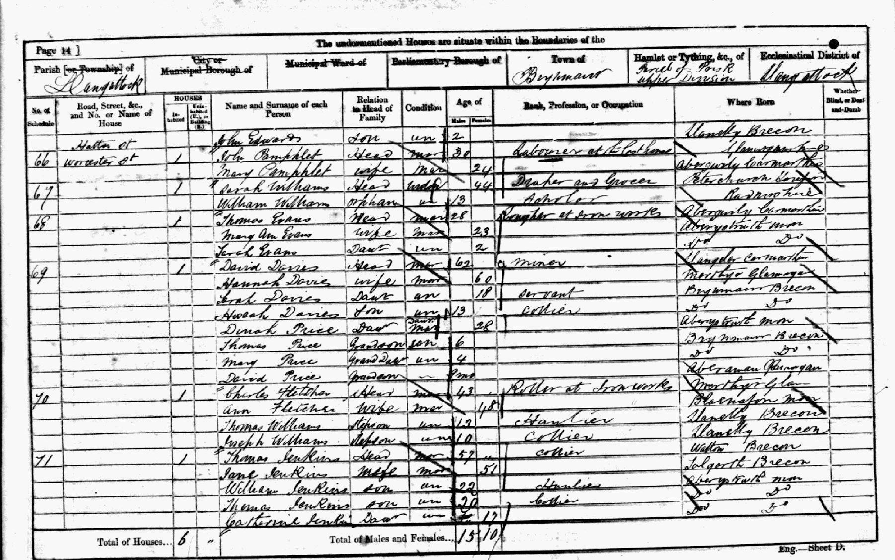 1861 Census, Worcester Street, Brynmawr, Breconshire, Wales