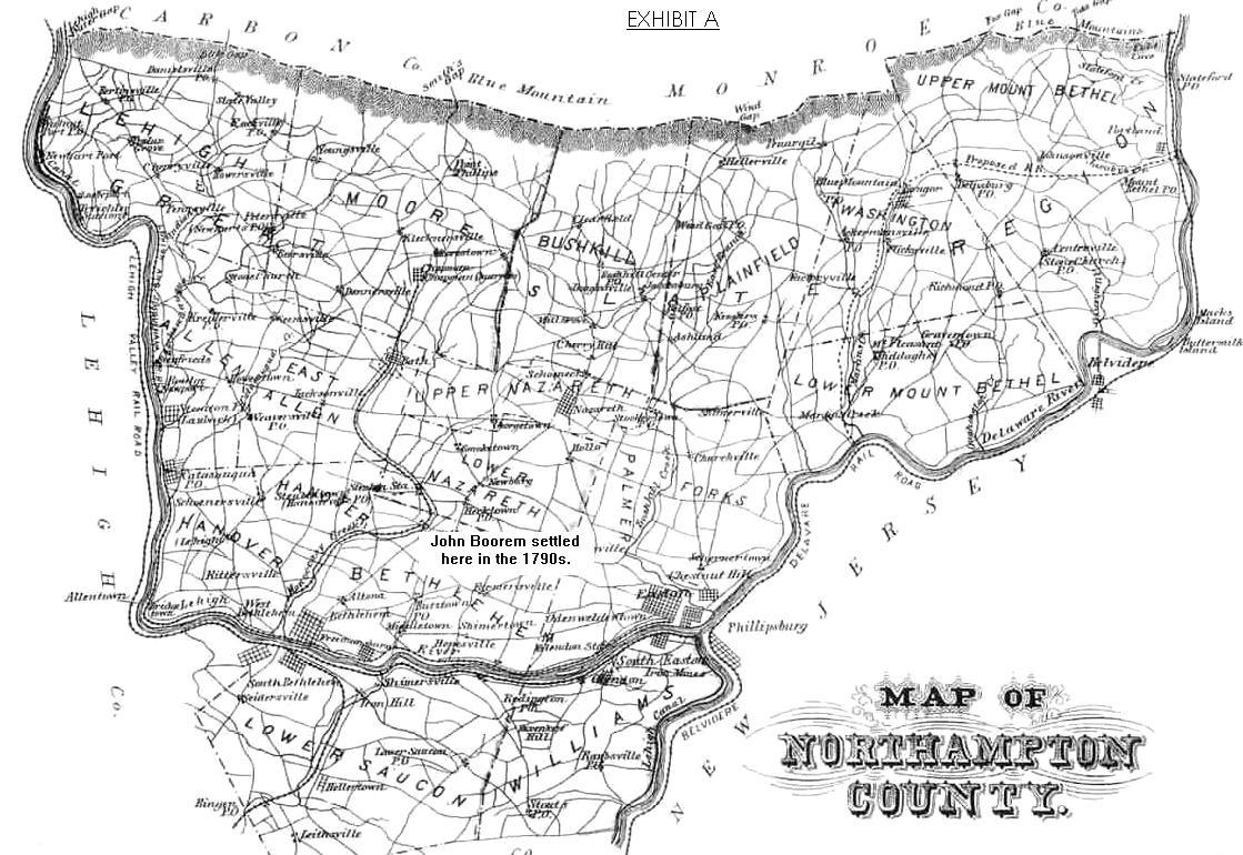 EXHIBIT A: Township map of Northampton County Pennsylvania, showing the location of Hecktown in Lower Nazareth Township, where John Boorem the immigrant settled in the 1790s.