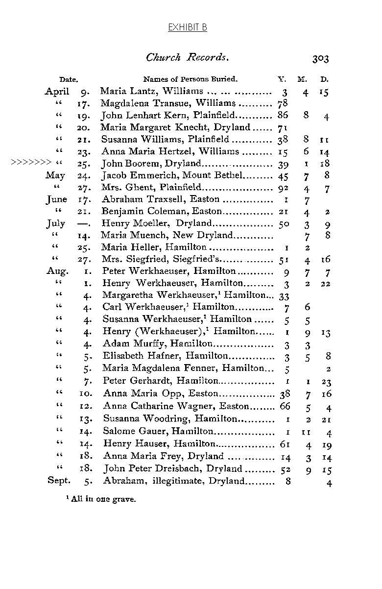 EXHIBIT B: Record of John Boorem's burial, 25 April 1810, from the records of the Dryland Church, Hecktown, Northampton Co., Pa., translated by Dr. Wm. J. Hinke, Auburn, NY, 1929.