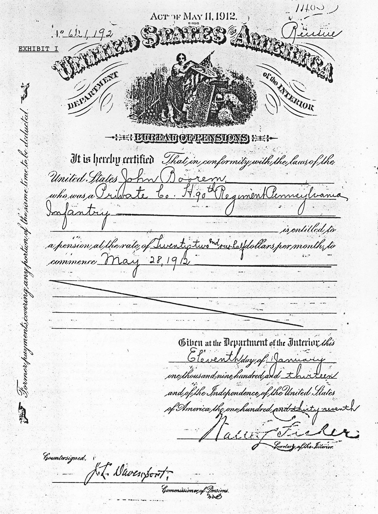 EXHIBIT J: John Boorem's Civil War pension certificate. The certificate is part of John Boorem's Civil War pension file found at the National Archives in Washington D.C. The file contains many documents and affidavits that provide a wealth of information about John and his family.