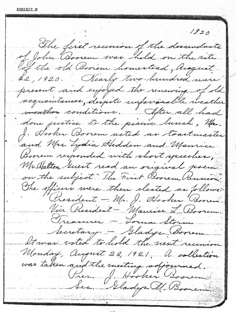 EXHIBIT N: Minutes from the first Boorem family reunion 22 August 1920. The reunion took place in Paradise Valley near the old John Boorem homestead. Officers were elected, speeches were made, and a collection was taken. The notes are in the hand of Gladys Boorem Yost, Secretary.