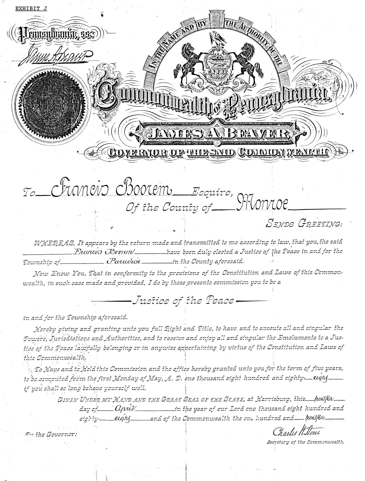 Francis Boorem Justice of the Peace certificate, 1888. Frank Boorem was Justice of the Peace for Paradise Township for 58 years, and was 90 years old when he finally retired from the position in 1926.
