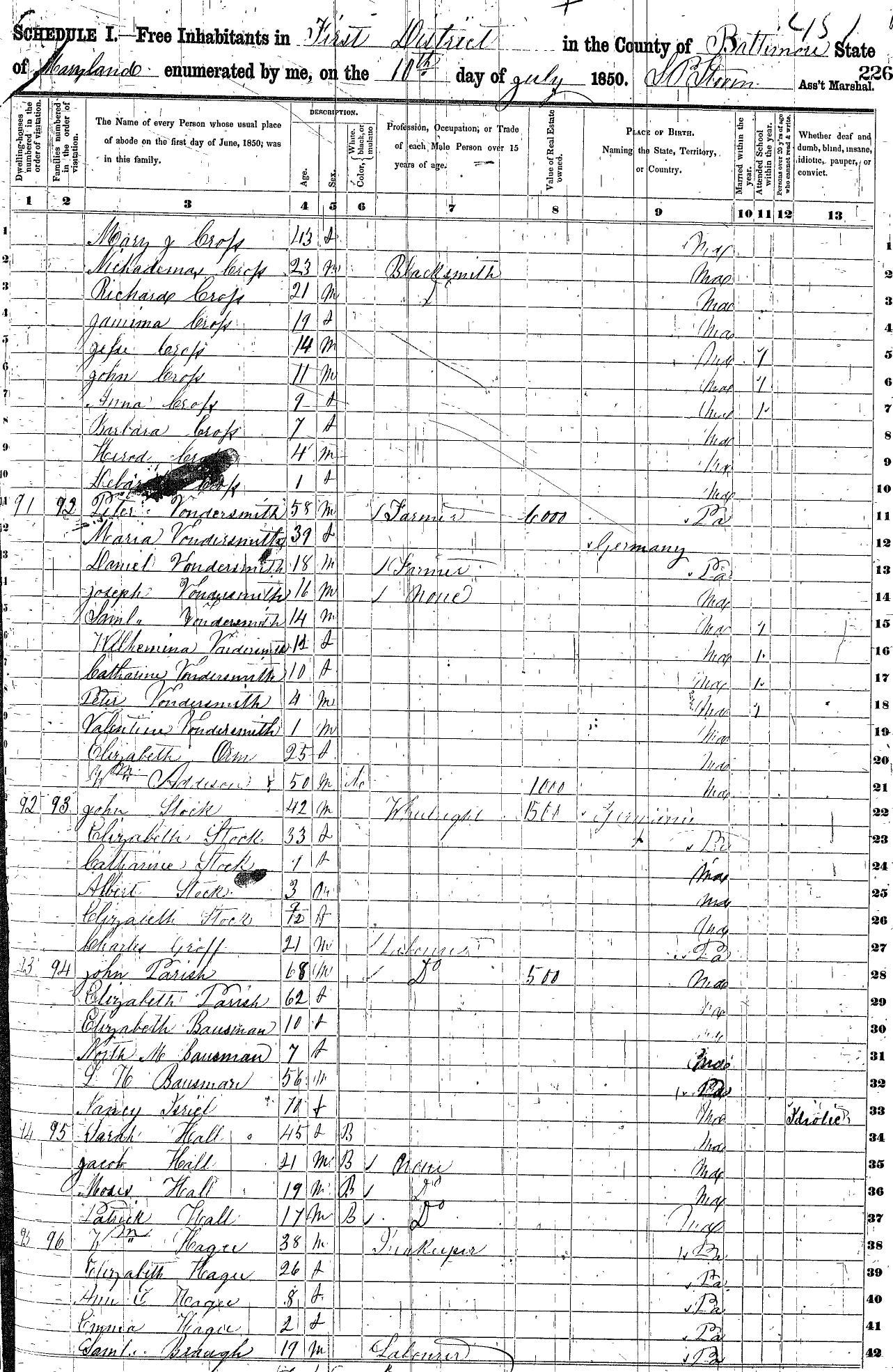 1850 Census, 1st District, Baltimore Co., MD