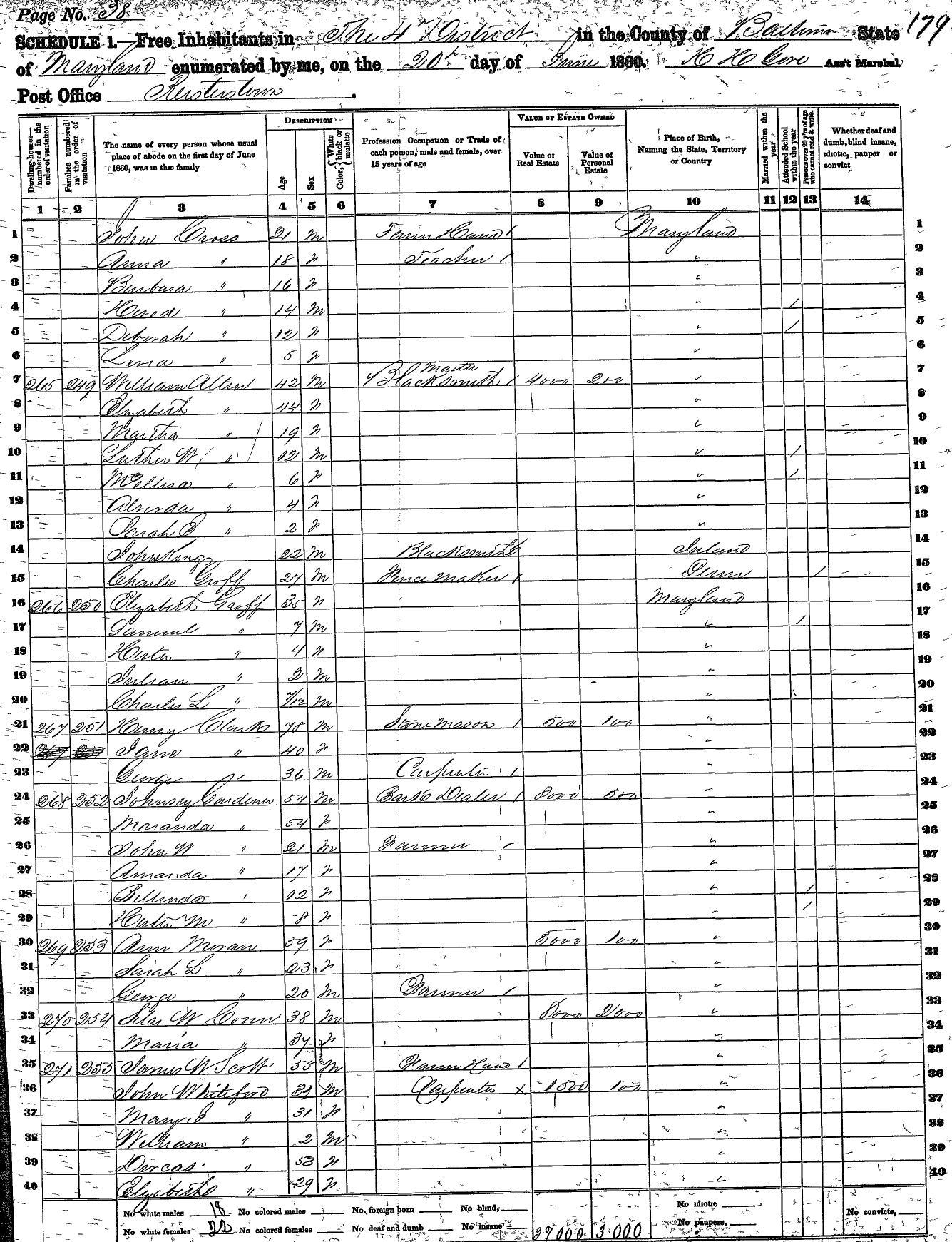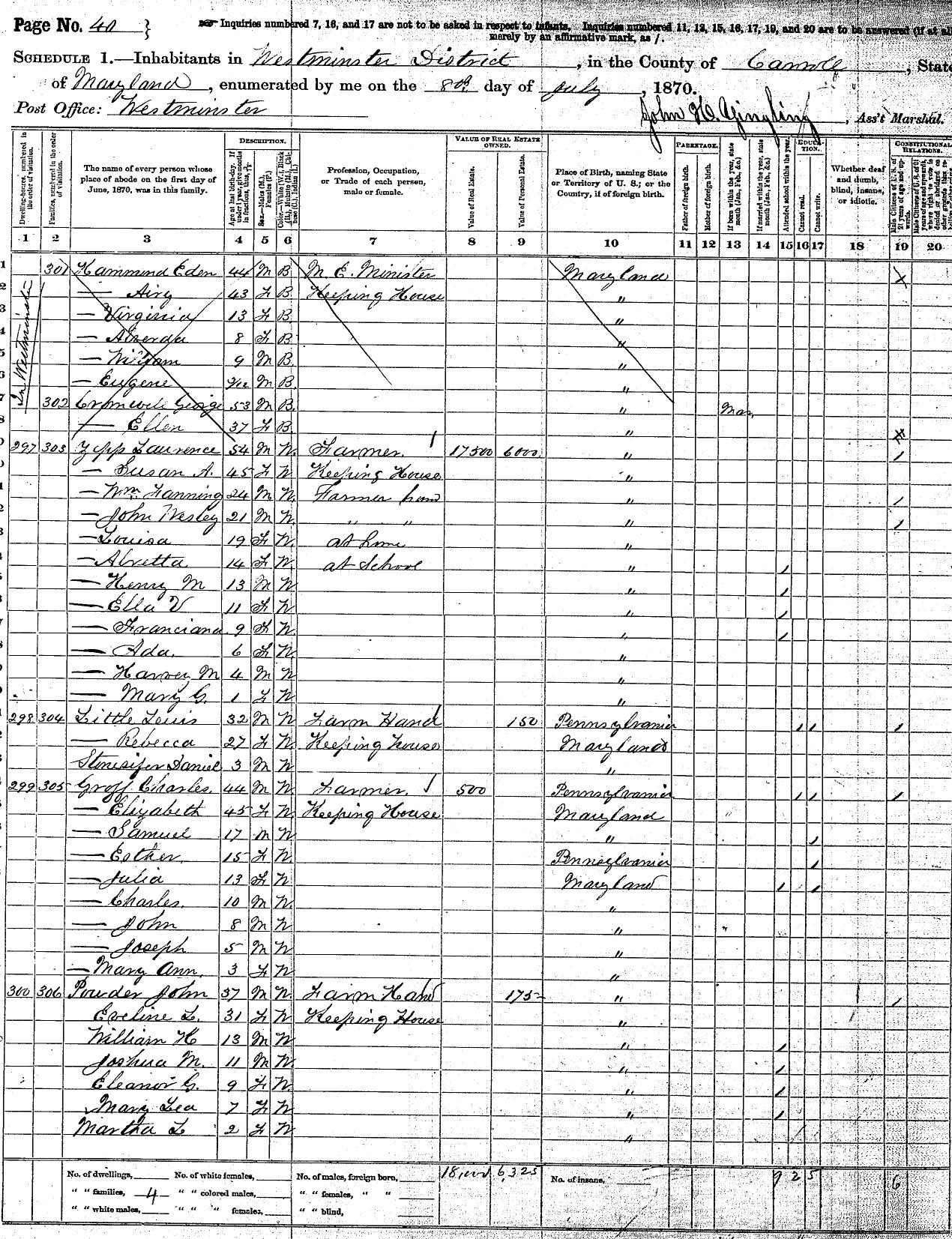 1870 Census, Westminster, Carroll Co., MD