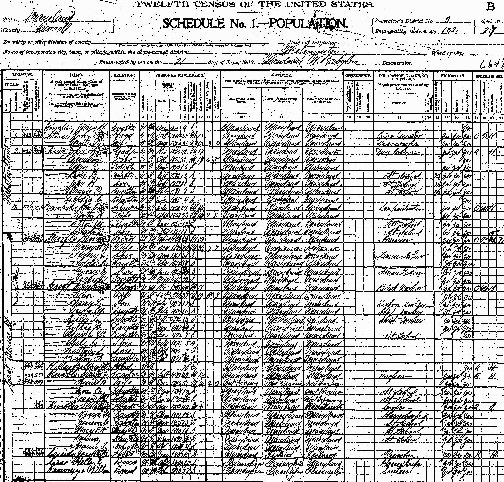 1900 Census, Westminster, Carroll Co., MD