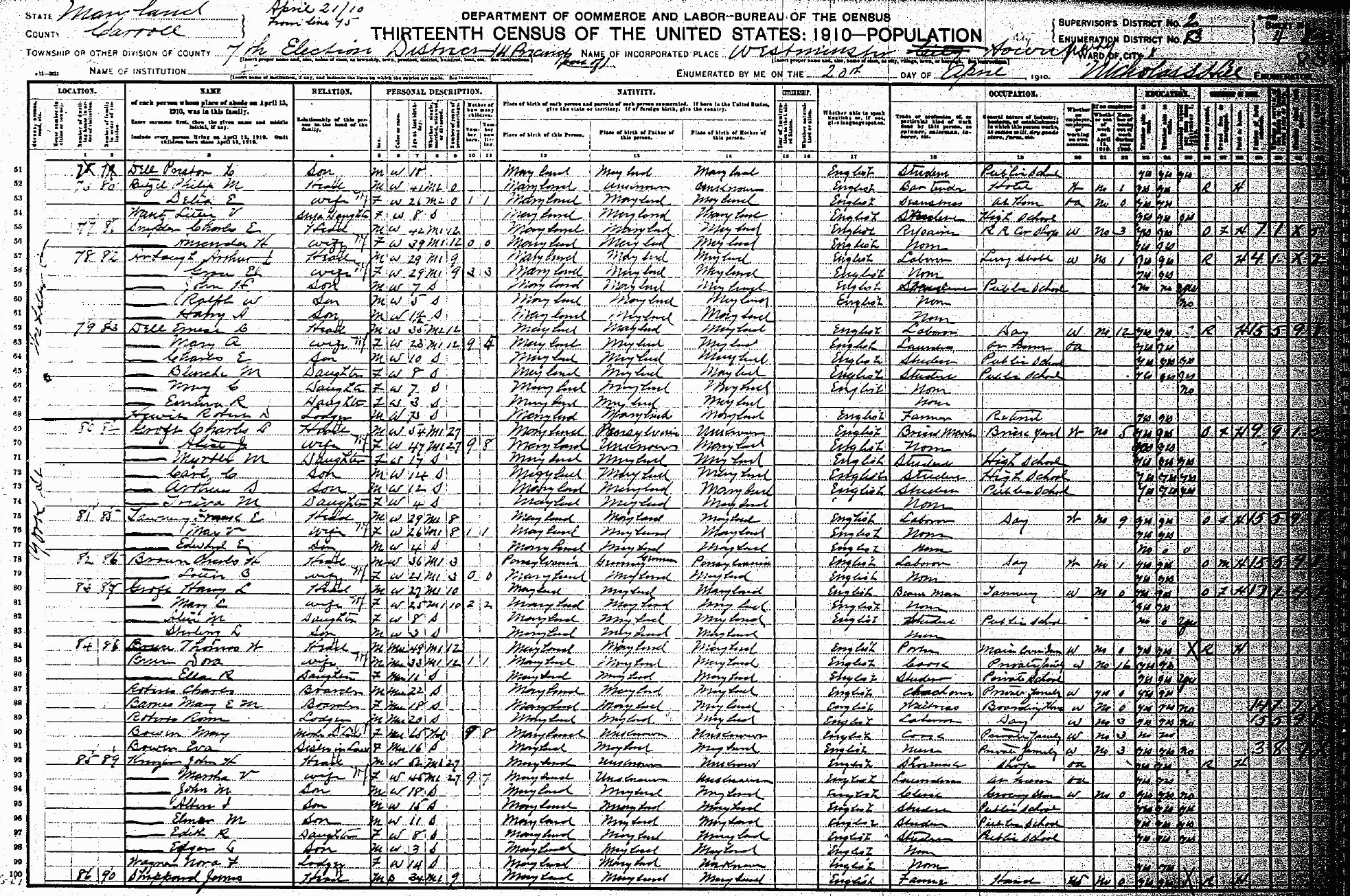 1910 Census, Westminster, Carroll Co., MD