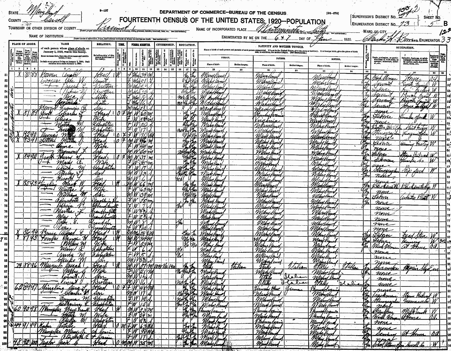1920 Census, Westminster, Carroll Co., MD