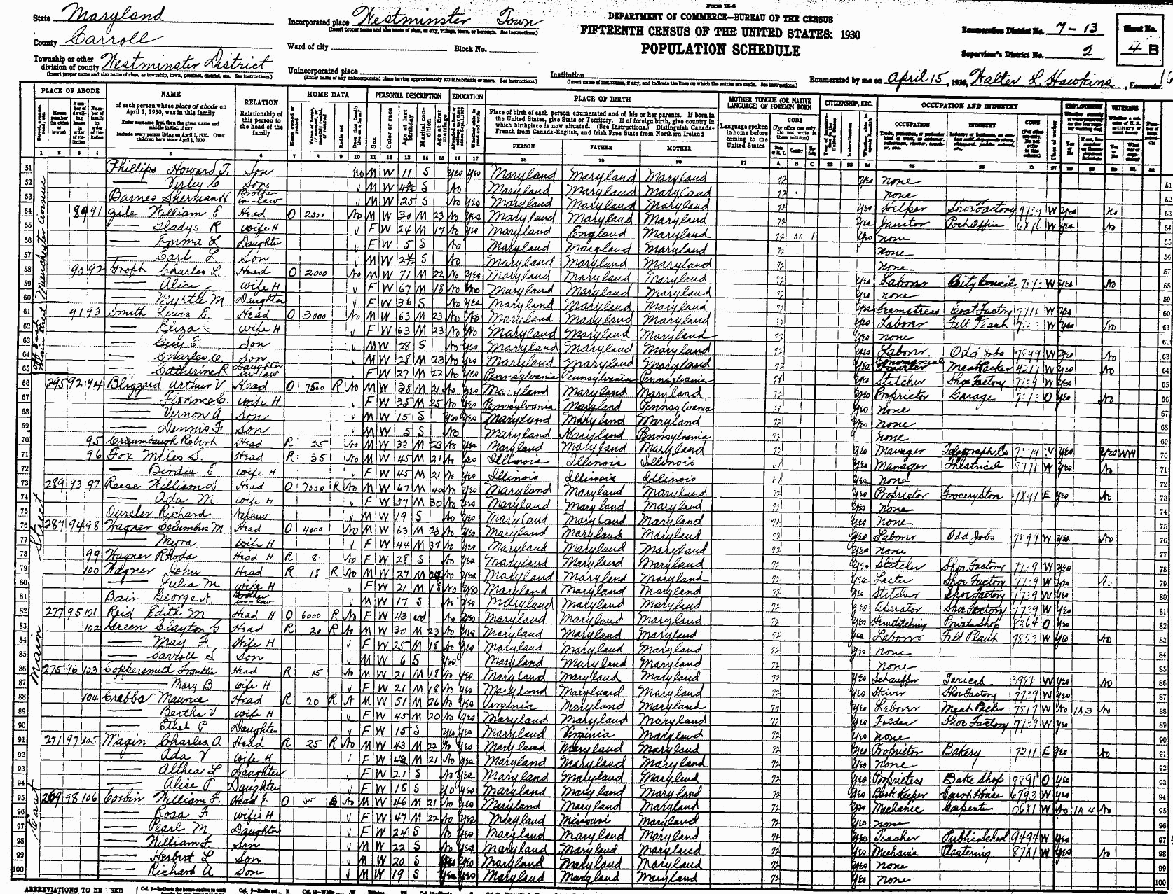 1930 Census, Westminster, Carroll Co., MD