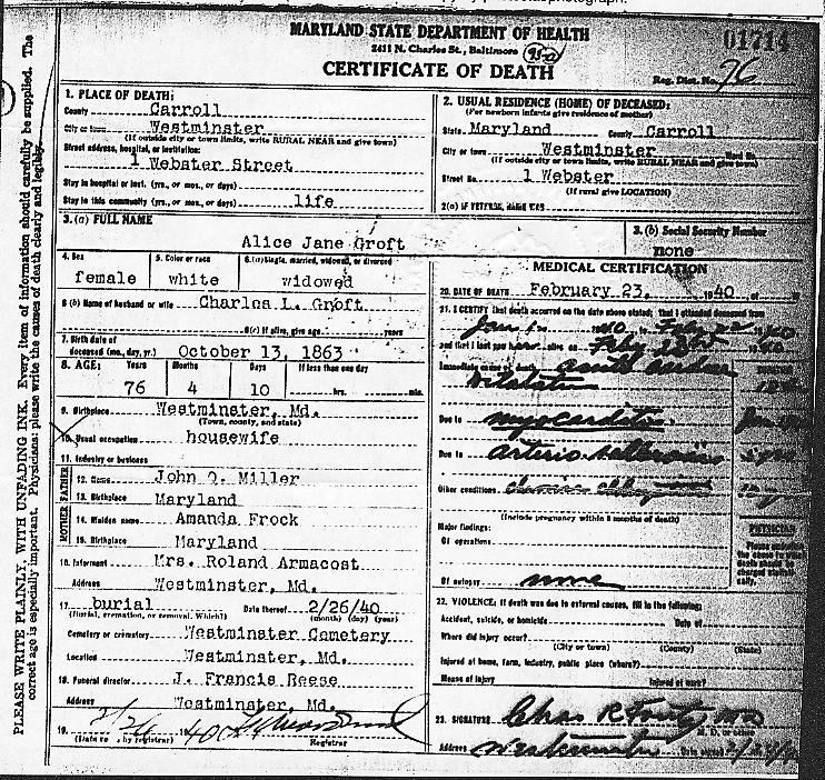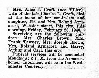 Obituary and Death Certificate of Alice Miller Groft