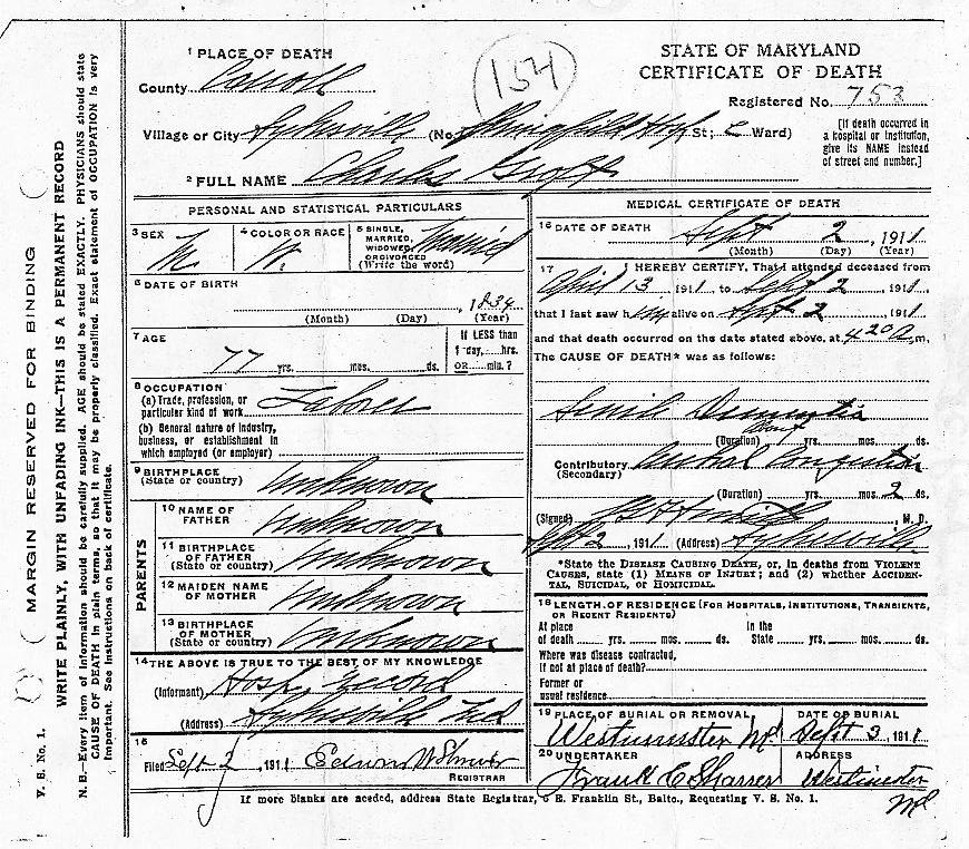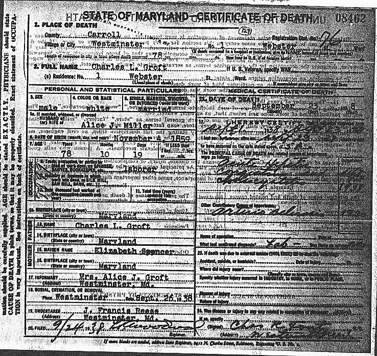 Charles R. Groft died on September 2, 1911, in Springfield hospital, Carroll County, MD. He was buried the next day in the Westminster cemetery, next to his wife Elizabeth (died 1898), and his daughters Mary Ann (died 1884), and Julia (died 1895). His obituary appeared the following week in the American Sentinel, a Westminster Newspaper.