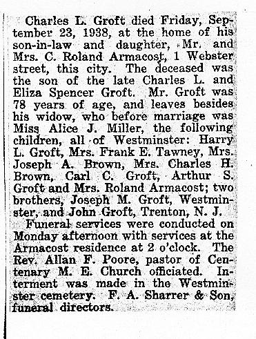 Below are photographs of the graves of Charles L. Groft, his wife Alice J. Miller, and their children buried in the Westminster Cemetery. Charles and Alice are in an seven-grave plot that includes their children Myrtle, Bertha, Arthur, and his wife Blanche Little and their son Francis. Sons Harry and Carl Groft and daughters Nellie Brown and Treva Armacost and their families are also buried in the cemetery.