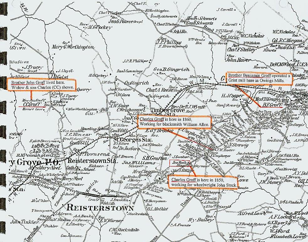 The atlas provides the location of the "Groff brothers" in the Reisterstown/Owings Mills Section of Baltimore County. Here we find the homes of (Mrs.) John Groft and her son Charles (C.C.), our own Charles R. Groft (1850 & 1860), and Benjamin Groft and his gristmill. Although the mill is long gone, there is still a house and barn on the Benjamin Groff site, which is close to the Baltimore Colts/Baltimore Ravens training complex in Owings Mills.