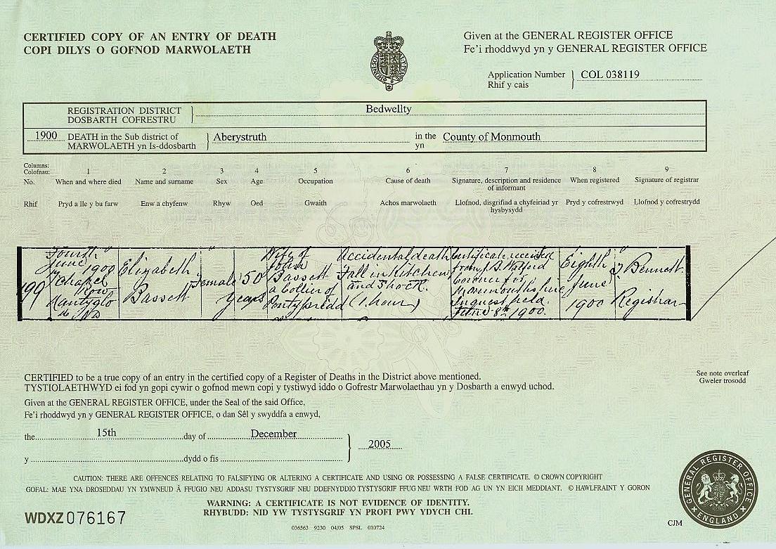 Elizabeth Hares was christened 11 Oct 1840, although, again, census returns indicate she was likely born in 1838. She married late in life, a collier from Pontypridd named John Bassett, and had one child, a son named John. She was the informant on her father's death certificate, and appears in the 1891 census of Nantyglo. Elizabeth died 4 June 1900, at her home On Chapel Row in Nantyglo, from "Accidental Death, Fall in Kitchen." There appears to have been some doubt as to the cause of Elizabeth's death, because her death certificate also indicates that an inquest was held into the circumstances of her death on 8 June 1900. Since the certificate makes no mention of the outcome of the investigation, we have to assume that the verdict of accidental death was upheld. She was buried with her mother and father in the Brynmawr cemetery.