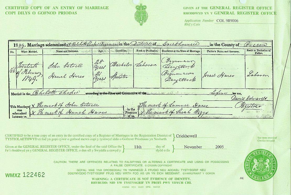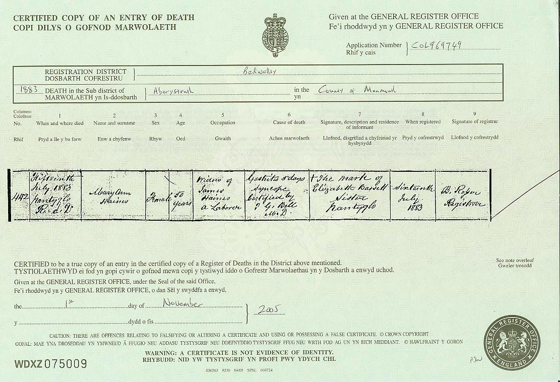 Mary Ann Hares was christened 5 May 1833, married James Haines, and raised a family in Nantyglo, Wales. Sons John and William Haines married raised families in Nantyglo, where they appear in the 1901 census. In March of 1876, daughter Elizabeth married Arthur Saunders in Brynmawr, and in October of that same year the couple emigrated to Australia where they raised a large family, and where descendants remain today. According to her death certificate Mary Ann Haines died in Nantyglo on 15 July 1883 after a 5-day bout with gastritis, and was buried in the Brynmawr Municipal cemetery with her husband James who died in 1875.