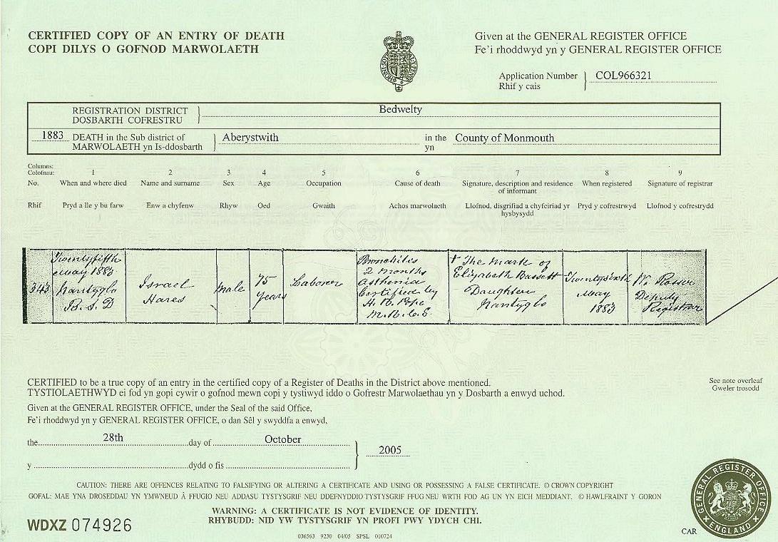 Israel Hares died in Nantyglo on 25 May 1883, following a 2-month bout with bronchitis, his death being reported by his daughter Elizabeth Bassett. Although Israel died in Nantyglo, he was buried in the Brynmawr municipal cemetery, likely due to the fact that by then many of Nantyglo's smaller chapel cemeteries had essentially closed due to overcrowding. With his death, the story of our Hares ancestors from Shipham, Somerset comes to a close. Although he was a miner or mine laborer for nearly all his life, Israel Hares managed to live into his early 80s, at a time when such an age was obtained by few individuals. At least two of his children, Hannah and George, (and perhaps Susanna), emigrated to America, while granddaughter Elizabeth Haines emigrated to Australia. As such, the descendants of Samuel Hares and Susannah Wookey and Israel Hares and Mary Ann Collins, came to inhabit several different corners of the globe, including, England, Wales, the United States, and Australia, where their descendants remain today. It hoped that this web site and this essay will cause other family members to contact me directly so that their family information can be added to this record.