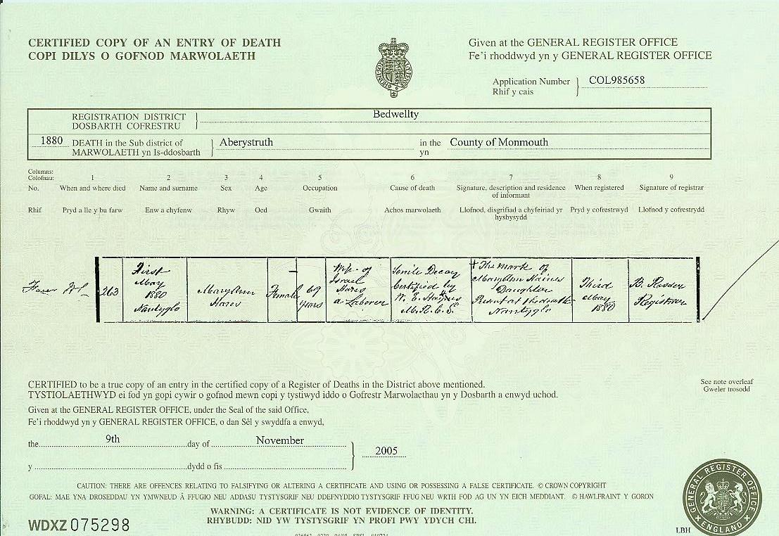 Mary Ann Hares died in Nantyglo of "senile decay" on 1 May 1880, and was buried in the Brynmawr Municipal Cemetery, opened in the early 1850s to help relieve the region's overcrowded chapel cemeteries. The certificate mentions that Mary Ann was the "wife of Israel Hares, a Labourer," and the informant was daughter Mary Ann Haines. Mary Ann Haines would die just three years later in 1883 and is also buried in the Brynmawr cemetery.