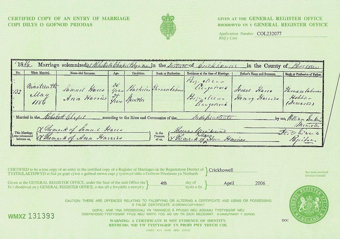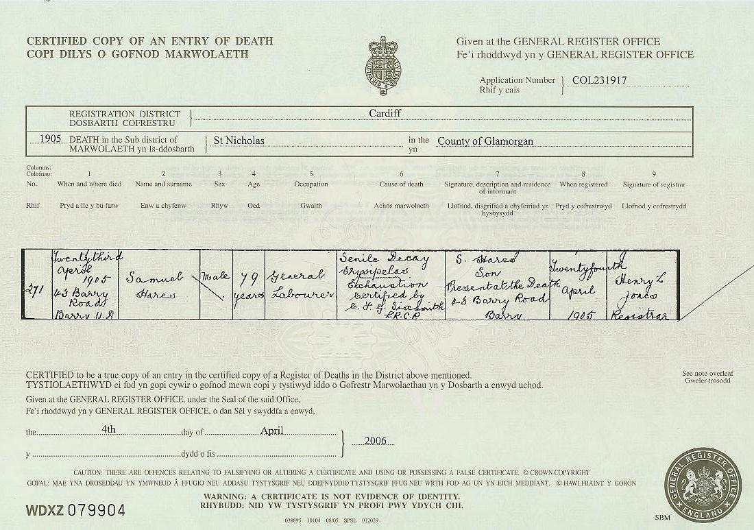 Hanna, wife of John Harding, aged 58 years.Samuel Hares was christened 17 July 1825 and was Israel and Mary Ann's eldest son. He appears to be missing from the 1841 and 1851 census, however we know that Samuel (like the rest of his family), by the late 1840s had moved to Brynmawr, Wales, because he stood as witness to the marriage of his sister Hannah in Brynmawr in 1849. In 1856 he married Ann Harries at Rehoboth Chapel, Brynmawr, and their only known child, Samuel, was born in 1868 Dowlais, Glamorganshire. In the 1861 census we find that Samuel, Ann and Ann's mother Mary were living next to Samuel's sister Mary Ann Haines and family outside Nantyglo, Monmouthshire, however by the time of the 1871 census the family had moved to Dowlais, where the aforementioned Samuel Jr. was born. By 1881 the family had moved to southern Glamorganshire (Swansea), and soon after settled in the town of Barry in extreme southern Glamorganshire, where we find Samuel and family in census returns for 1891 and 1901. Samuel Hares died from "Senile Decay," and "Exhaustion" at his home on Barry Road in Barry, 23 April 1905, at age 79. Having reached this age, he appears to have been the longest surviving child of Israel and Mary Ann Hares.