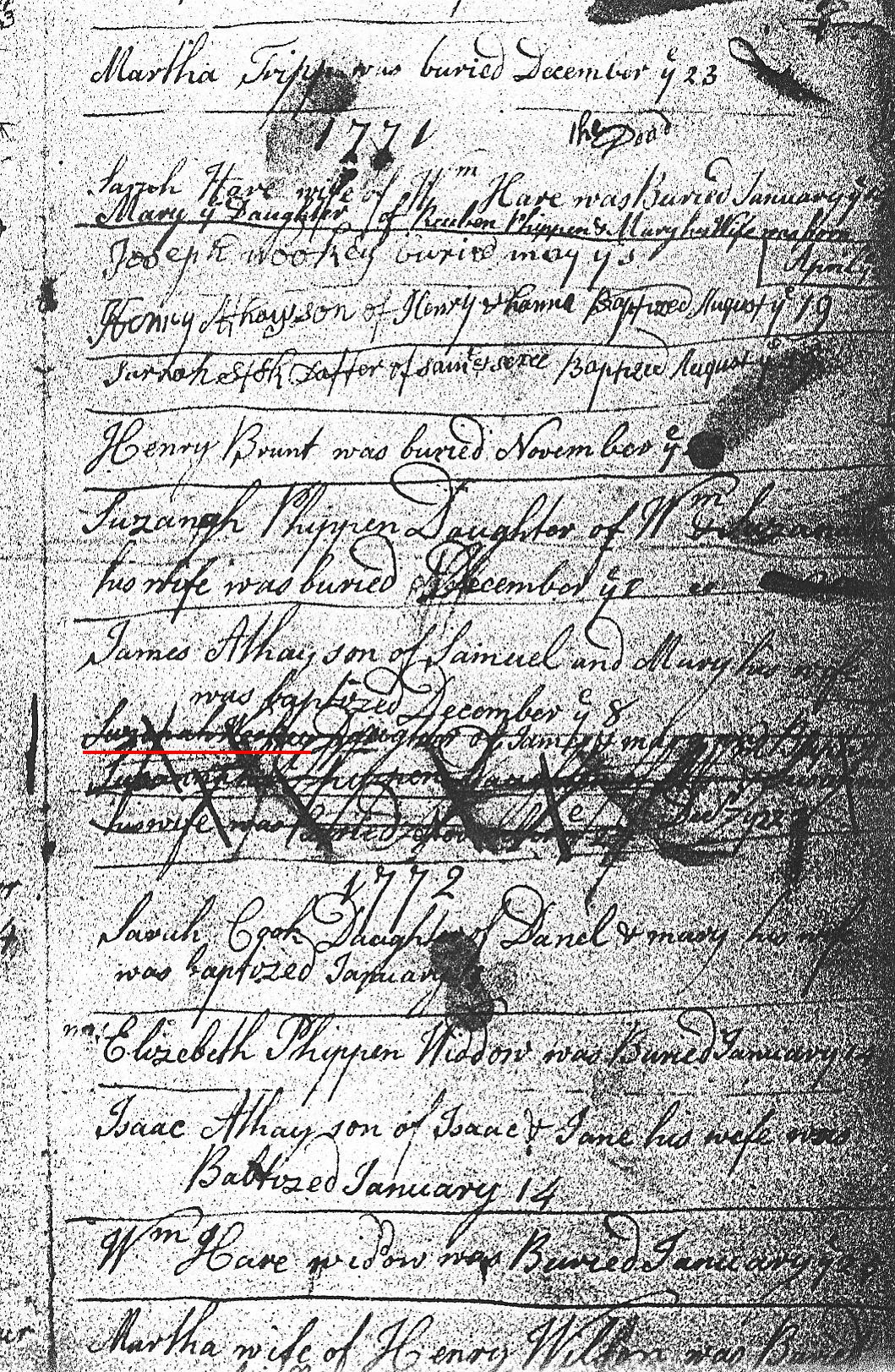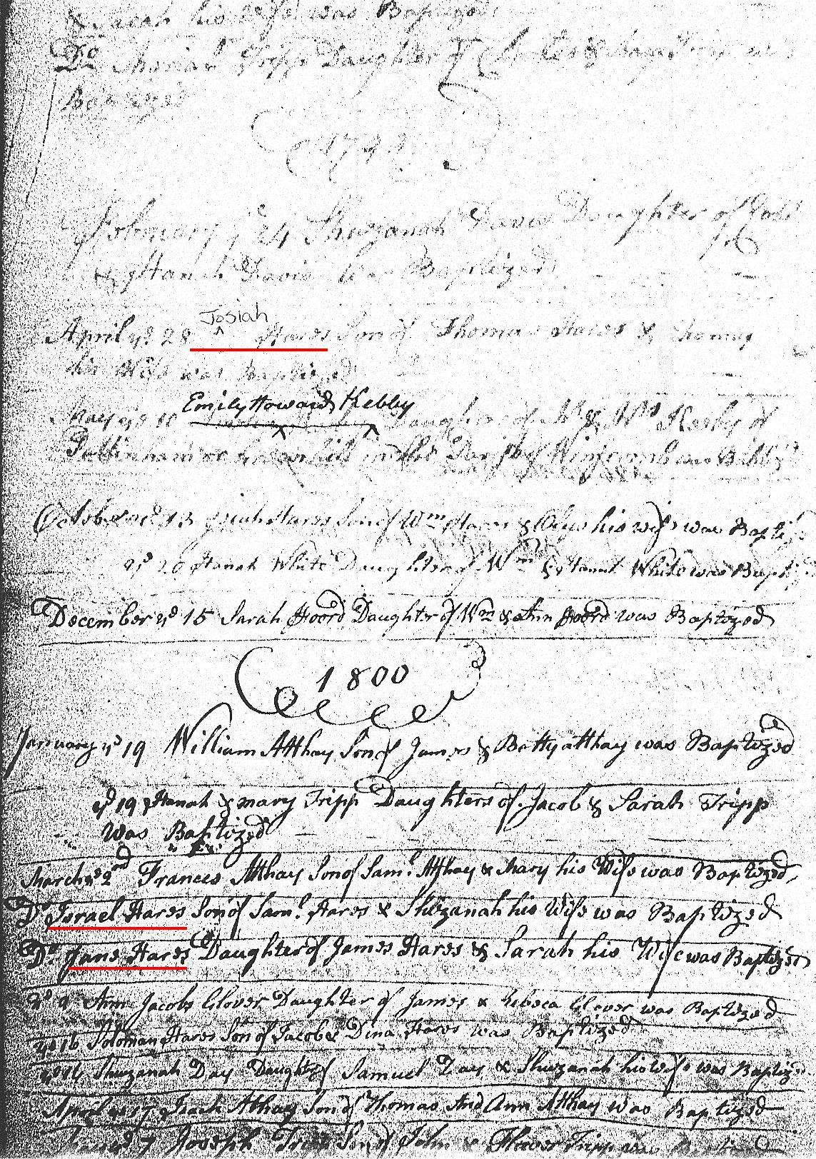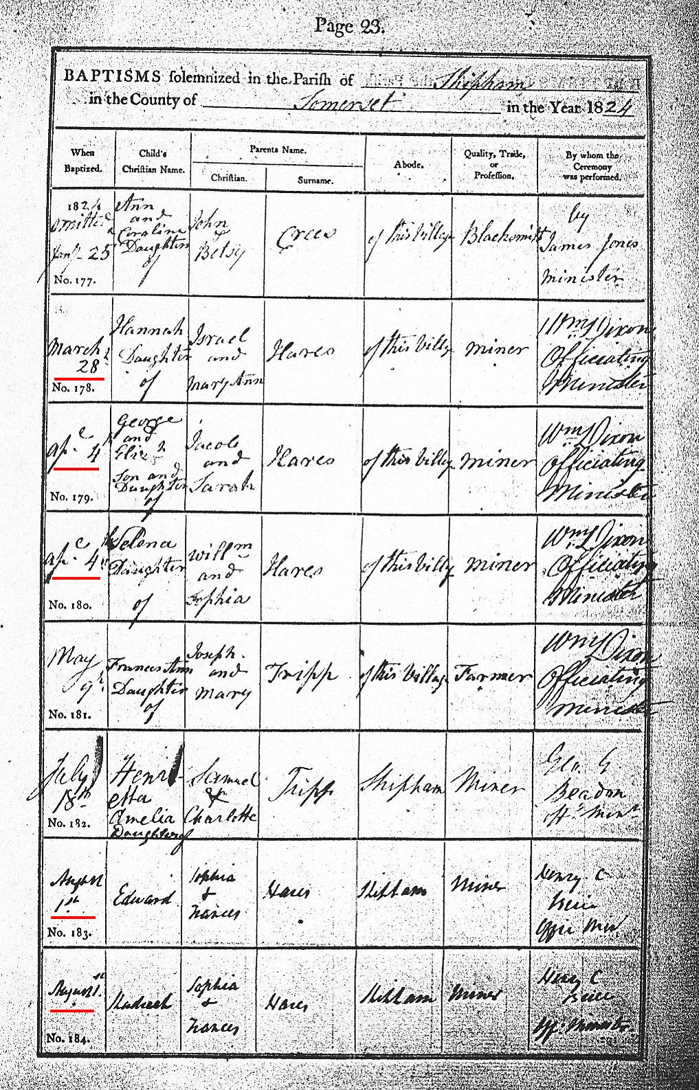 Simon Hares, christened 25 Dec 1780 Parish records indicate that Samuel Hares married Fanny Lovell on 25 Oct 1784, and that the widowed Samuel Hares remarried Susanna Wookey on 26 Dec 1793. Susanna was the daughter of James and Mary Wookey of Shipham and was also baptized at St. Leonard's, however her baptism entry is a bit curious. It is one of the three final entries (baptisms) written in the register for the year 1771, and inexplicably all three entries, though legible, have been lined through. The entry for Susannah's baptism appears to lack a date, although a date of 22 December found immediately below the 2nd entry in the group could conceivably be the correct for both baptisms. The third and final entry contains a baptism date of 24 November. Even with this bit of ambiguity surrounding Susannah's baptism date, most researchers (including myself) have adopted a date of December 1771 for Susannah's baptism.
