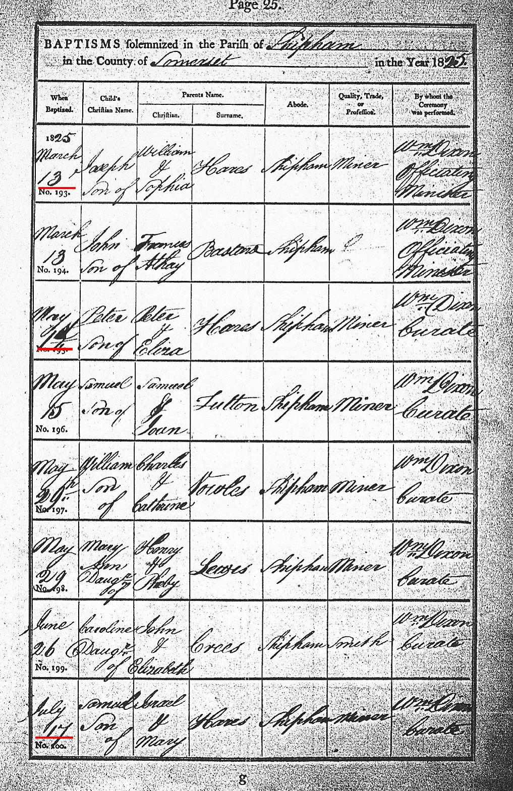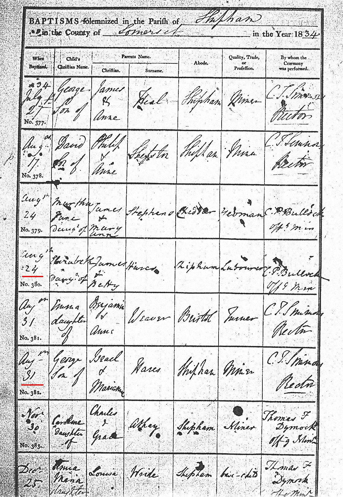 We begin by mentioning the family of George's grandfather, Samuel Hares. Records from the church of St. Leonard's in Shipham indicate that Samuel Hares was christened at the church on 1 May 1763, and was the son of Joseph and Mary Hares. If we can assume that during this time period there was only one couple named Joseph and Mary Hares having their children baptized at the church, it would appear that Joseph and Mary's family included the following children:
