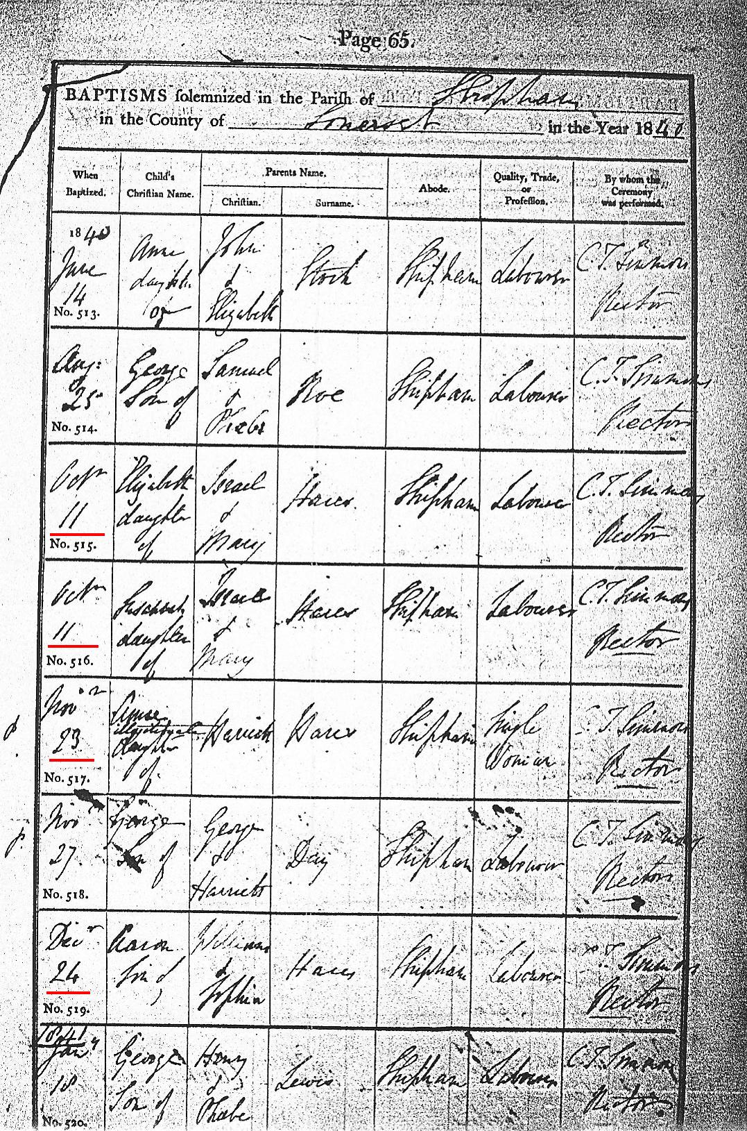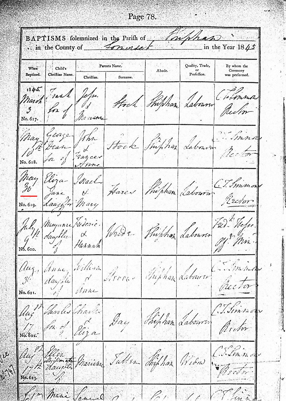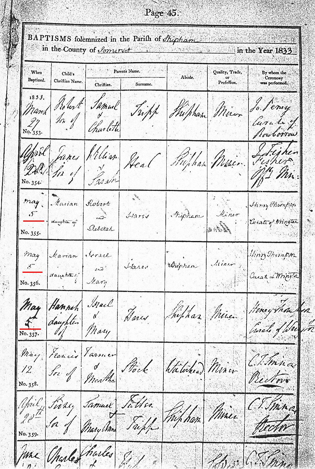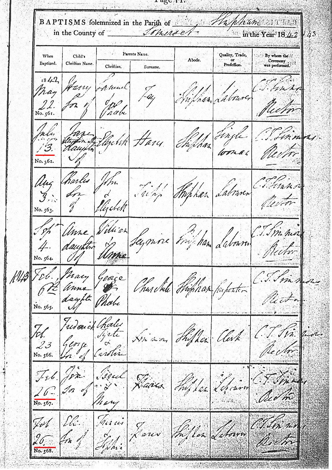 John(?) Hares. There is a baptism record for a son of Israel and Mary Hares dated 20 Feb 1843. Although the first name is difficult to read, it appears to be John. Since there is no individual matching this description with Israel and family in the 1841 census of Shipham, it is likely that "John" died in infancy or early childhood.