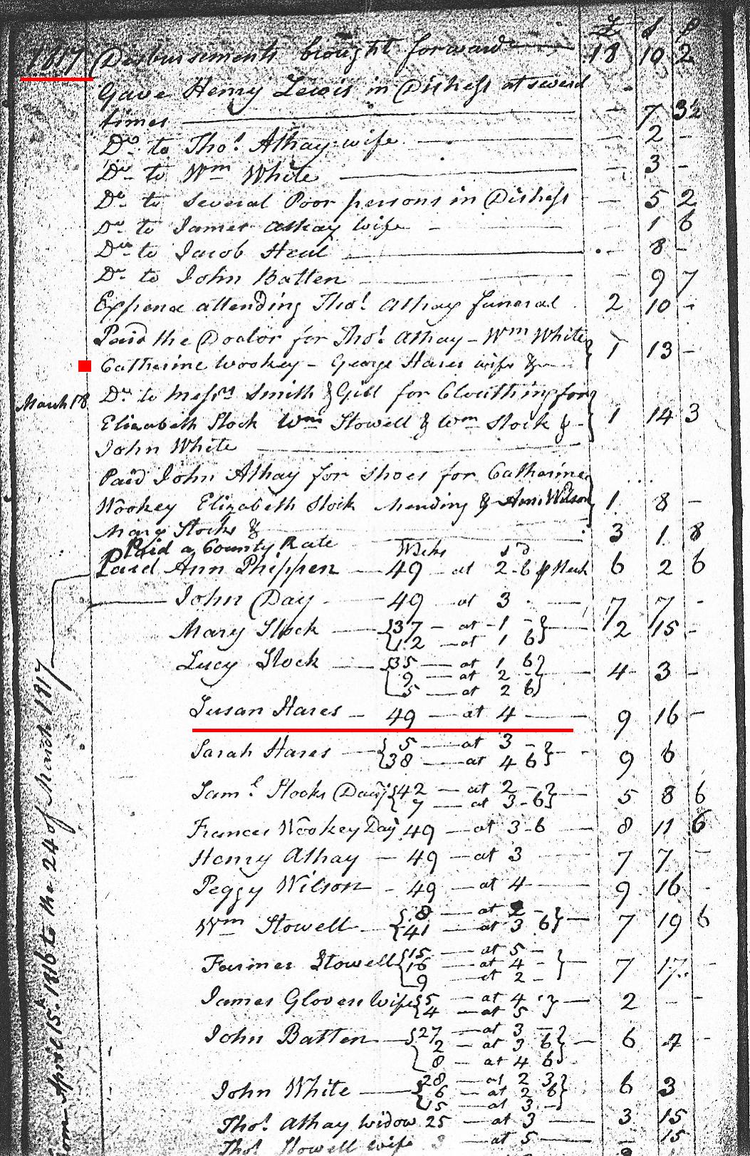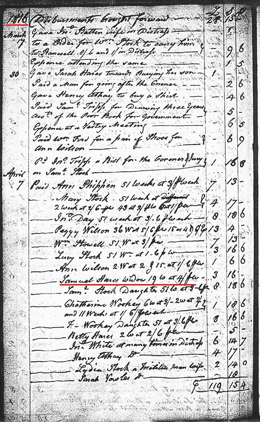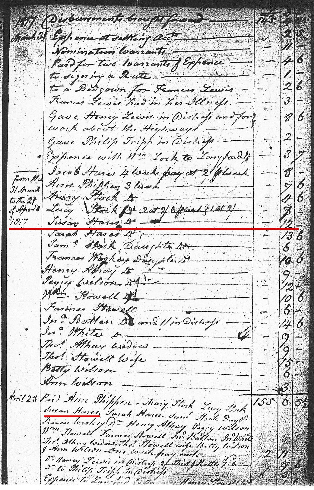 Date Entry Amount (P-S-P) Comments 2 June 1815 Gave Samuel Hares wife in distress 0-2-0 Susanna makes her first appearance in the Overseer's Accounts 4 June 1815 Gave Samuel Hares wife in distress 0-3-0 5 June 1815 Gave Samuel Hares wife in distress 0-2-0 17 June 1815 Gave Samuel Hares wife in distress 0-3-0 8 July 1815 Gave Samuel Hares wife in distress 0-3-0 15 July 1815 Gave Samuel Hares wife in distress 0-3-0 29 July 1815 Gave Samuel Hares wife in distress 0-3-0 7 April 1816 Paid Samuel Hares widow 19 w at 4/per 3-16-0 Samuel died in Nov of 1815 and here Susanna makes her first appearance as his widow 15 Apr 1816 - 24 Mar 1817 Susan Hares 49 -- at 4 -- 9-16-0 Susan appears as "Susan Hares" from here forward 31 Mar 1817 Paid to Susan Hares one week 0-4-0 31 Mar 1817 - 21 Apr 1818 Susan Hares 2 at 2/??? 0-12-0 28 April 1818 Susan Hares (along with others) 2-11-0 11 Aug 1817 - 23 Mar 1818 Susan Hares 21 weeks at 0-3-0(?) 4-16-0