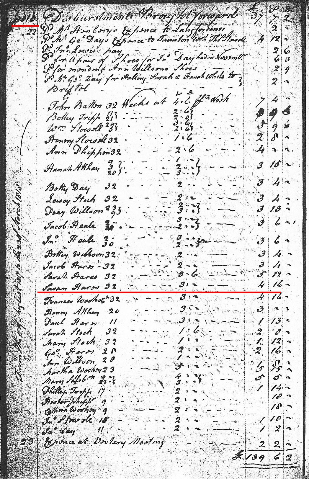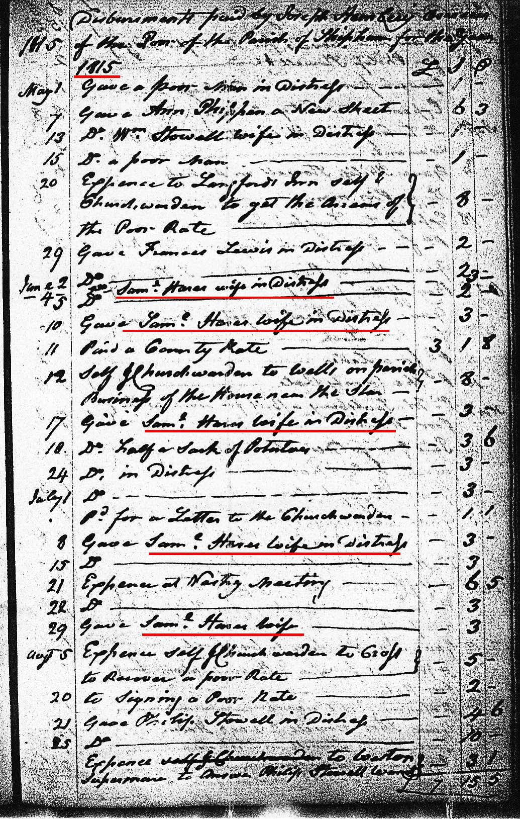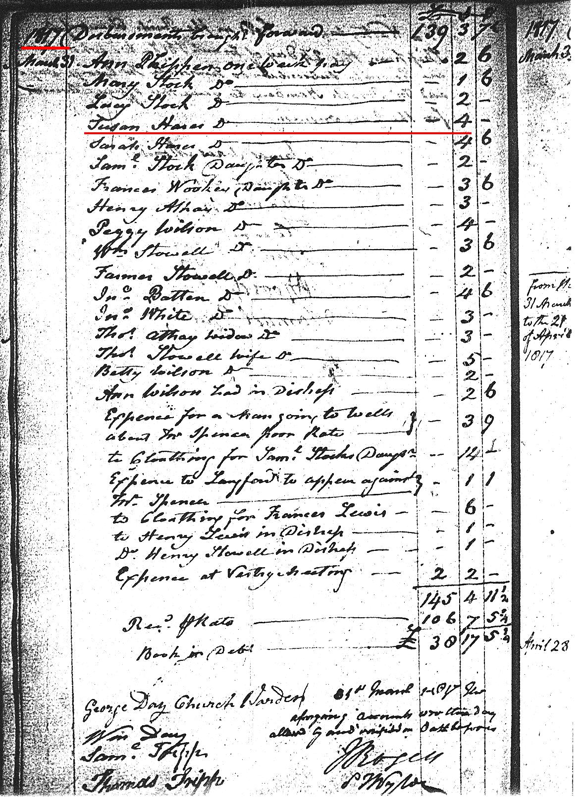 Date Entry Amount (P-S-P) Comments 2 June 1815 Gave Samuel Hares wife in distress 0-2-0 Susanna makes her first appearance in the Overseer's Accounts 4 June 1815 Gave Samuel Hares wife in distress 0-3-0 5 June 1815 Gave Samuel Hares wife in distress 0-2-0 17 June 1815 Gave Samuel Hares wife in distress 0-3-0 8 July 1815 Gave Samuel Hares wife in distress 0-3-0 15 July 1815 Gave Samuel Hares wife in distress 0-3-0 29 July 1815 Gave Samuel Hares wife in distress 0-3-0 7 April 1816 Paid Samuel Hares widow 19 w at 4/per 3-16-0 Samuel died in Nov of 1815 and here Susanna makes her first appearance as his widow 15 Apr 1816 - 24 Mar 1817 Susan Hares 49 -- at 4 -- 9-16-0 Susan appears as "Susan Hares" from here forward 31 Mar 1817 Paid to Susan Hares one week 0-4-0 31 Mar 1817 - 21 Apr 1818 Susan Hares 2 at 2/??? 0-12-0 28 April 1818 Susan Hares (along with others) 2-11-0 11 Aug 1817 - 23 Mar 1818 Susan Hares 21 weeks at 0-3-0(?) 4-16-0