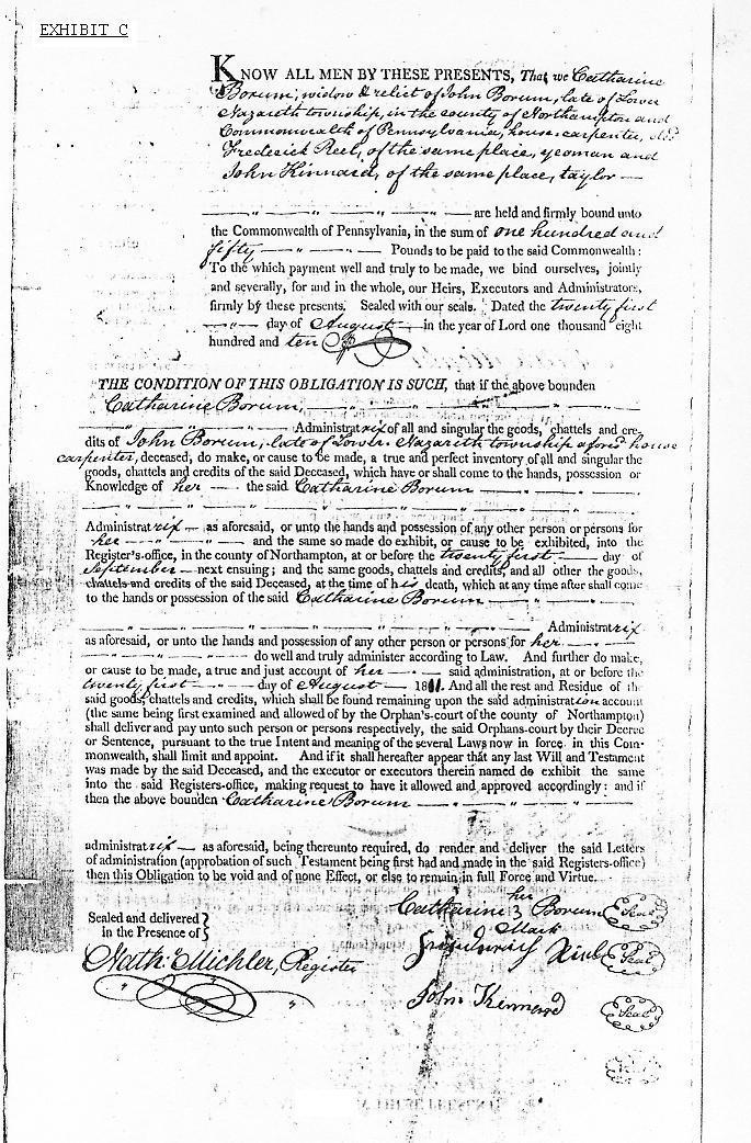 Administration document from the Estate of John Boorem on file at the Northampton County Courthouse in Easton, Pa. (file #2711). The papers name John's wife Catherine as executrix of her husband's estate, and the papers also tell us that John Boorem was a "house carpenter."