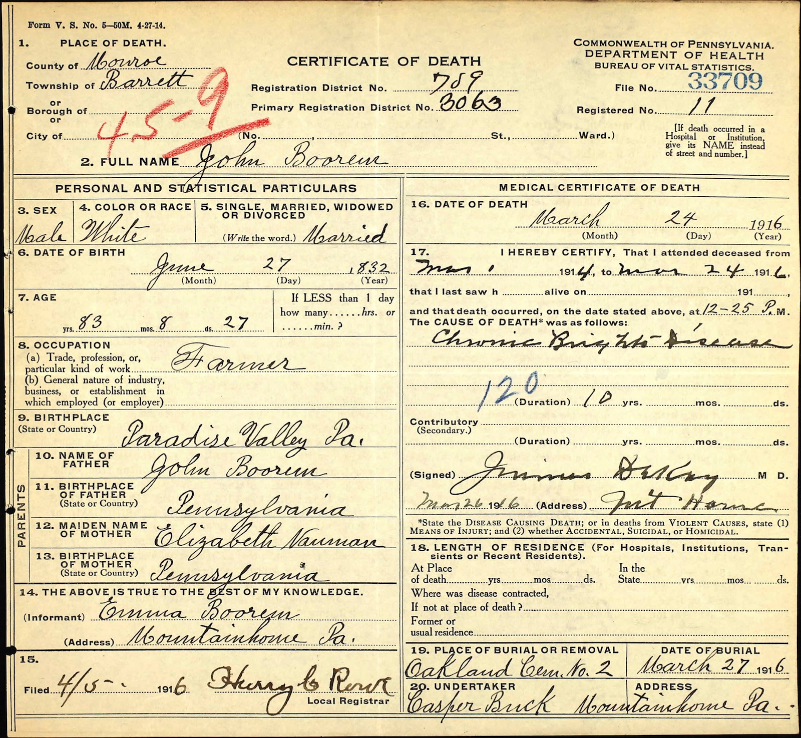 John Boorem died on 24 March 1916, three months short of his 84th birthday. The official cause of death was "chronic kidney disease." His obituary that appeared three days following his death in the Stroudsburg newspaper, "The Morning Press," reads as follows: