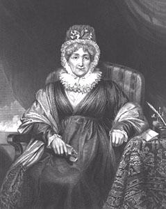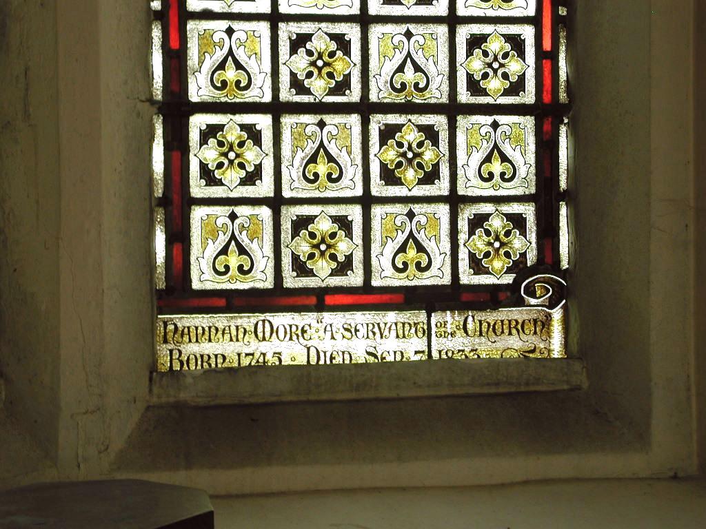 Four of the windows have modern stained glass. One, behind the font, is of two dedicated Christian women of the early church, Dorcas and Phoebe, given in memory of Hannah More (depicted at right), the philanthropist and teacher who came to Shipham and set up a school in 1790. The window behind the alter commemorates a former rector, the Revd Melmoth A. Lintern. A third window depicts St. Leonard, with a prisoner in chains and the fourth recalls the coronation of King Edward VII. See if you can spot the dice in the window behind the alter!