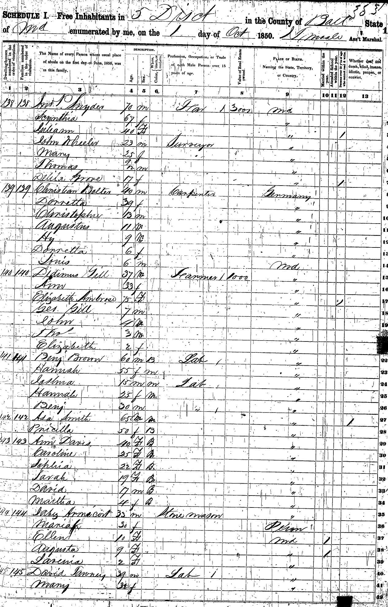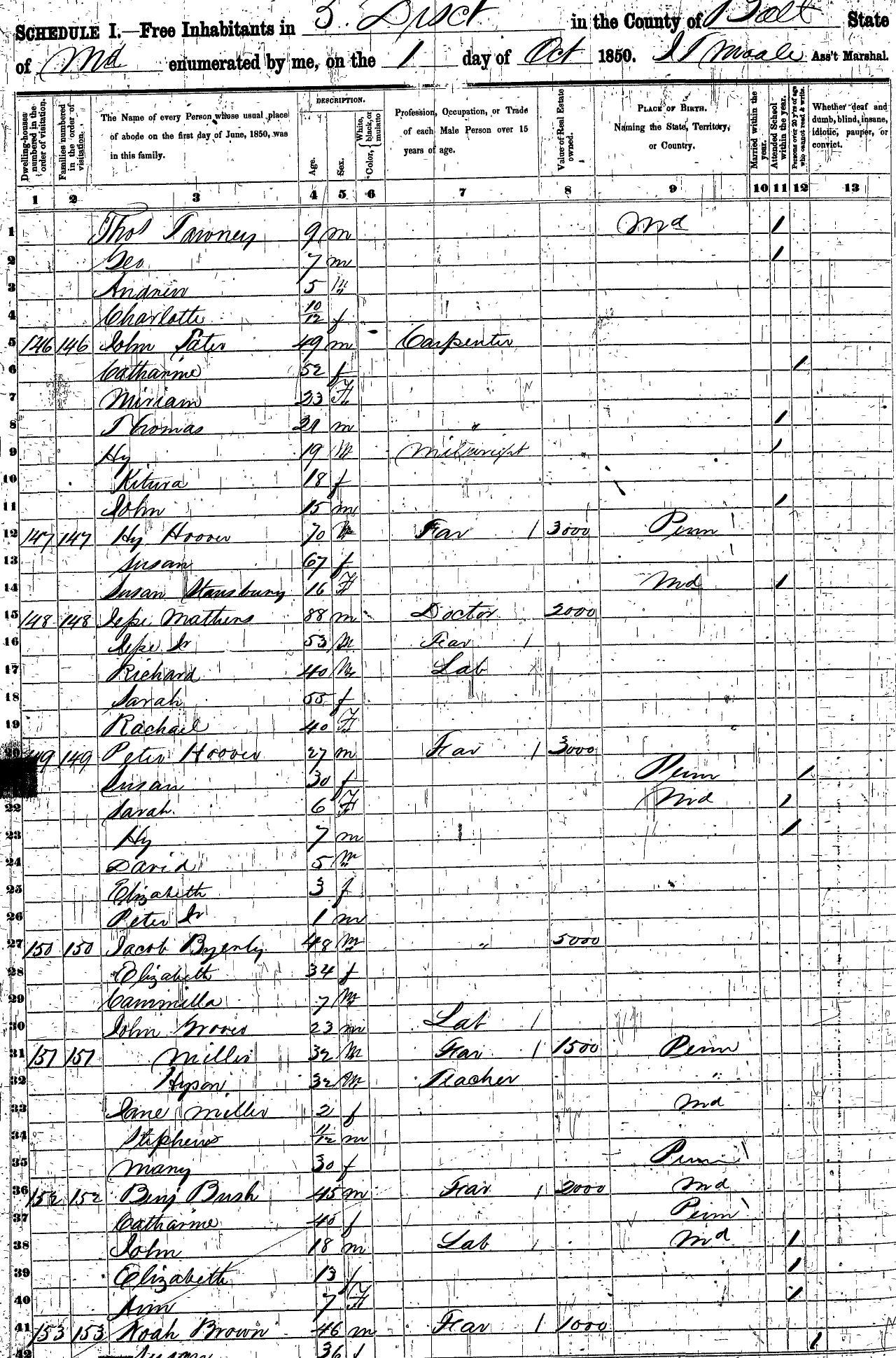 1850 Census, 5th District, Baltimore Co., MD, Page 1 and Page 2
