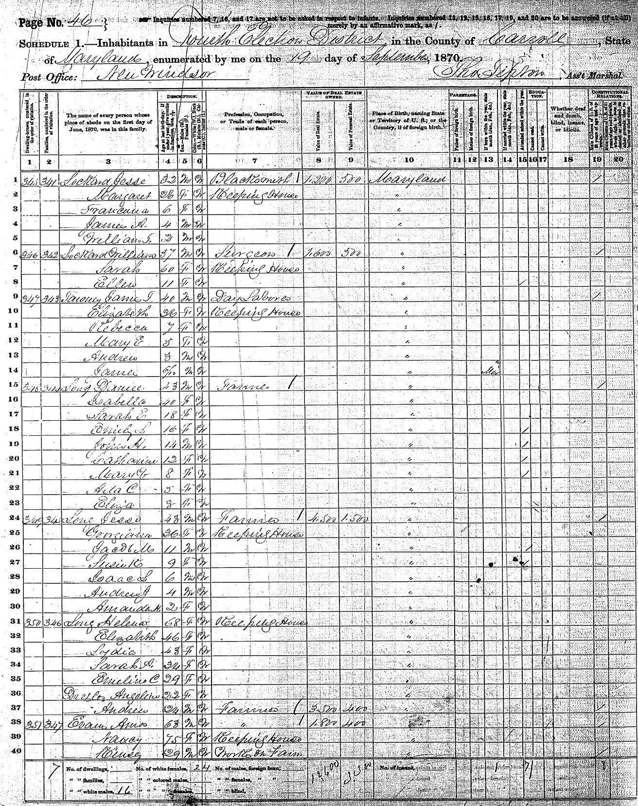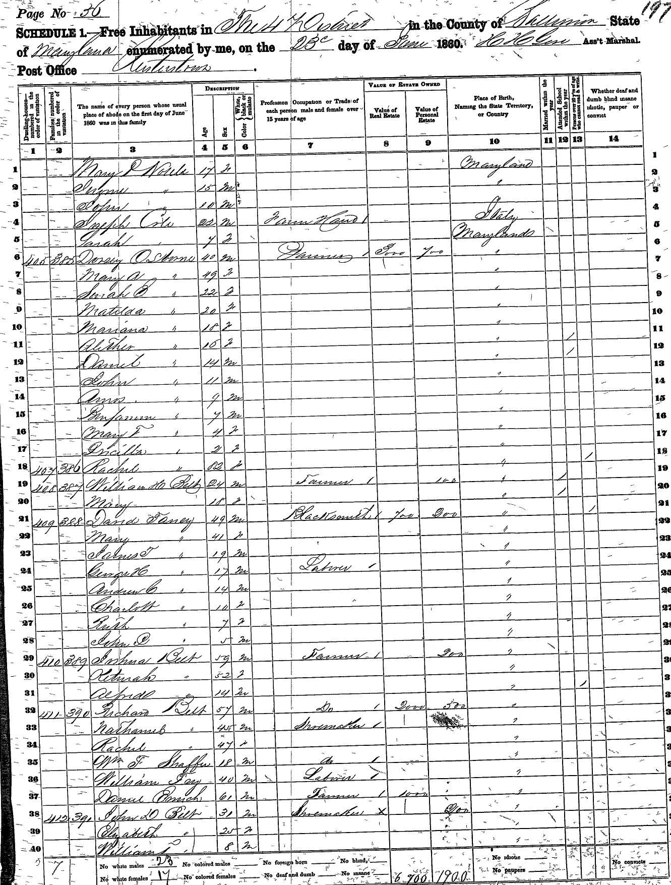 In the census of 1860 the Tawney Family is still living in the 5th District of Baltimore County, Maryland, Post Office - Reisterstown. Although the 1850 census was the first modern census, the information offered was minimal. It was not until 1860 and 1870 that other useful details began to be included in the returns.