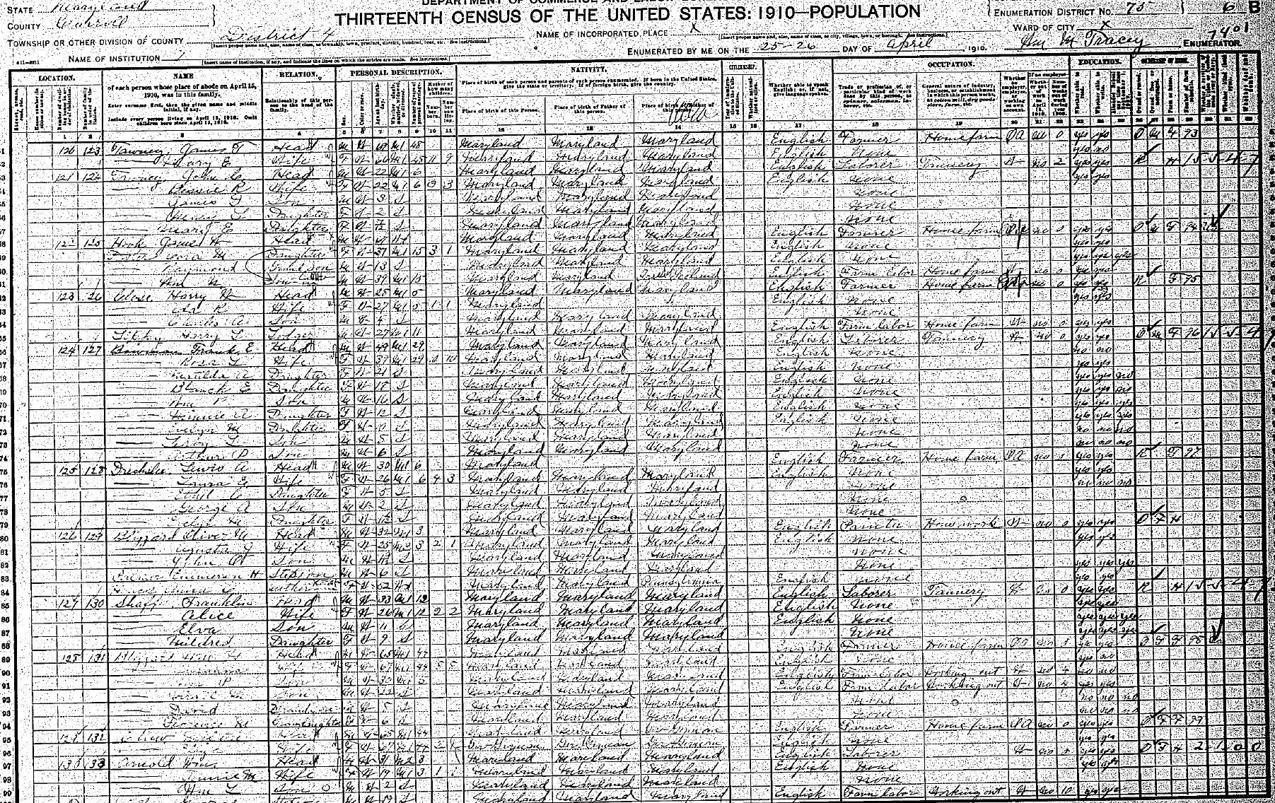 Over in District 7 of Carroll County (closer to Westminster) we find the families of children James T. Tawney, Jr., Andrew Tawney, and Milton & Annie Tawney Little. James Tawney is working as a laborer for the railroad, Andrew is listed as a farmer, while Milton Little's occupation is listed as "works on lines - Taney"