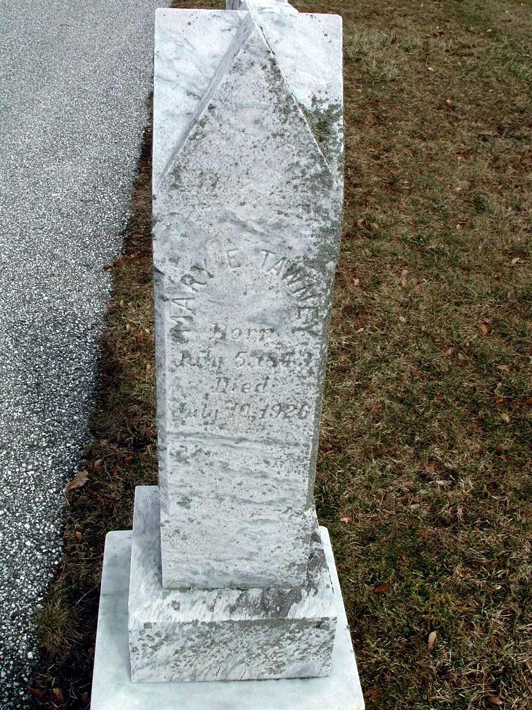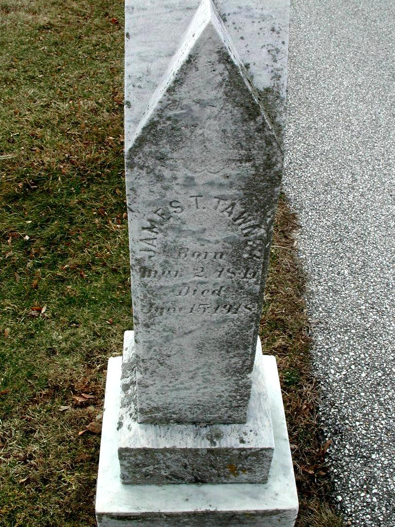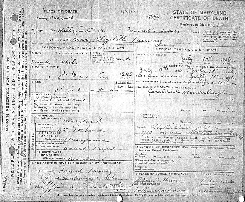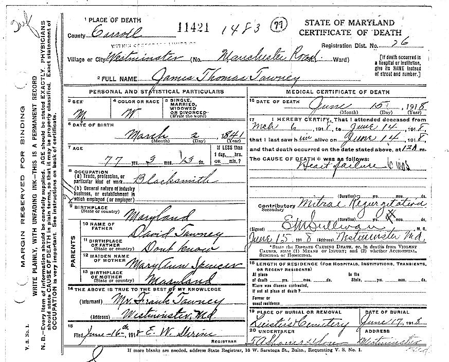 James Thomas Tawney died on 15 June 1918, and was buried at the Leister's church cemetery, where many members of the Tawney-Little family are interred. According to his death certificate the cause of death was heart failure. He was 77 years old. His obituary appeared in the American Sentinel, a Westminster newspaper, on June 21st, as follows: "Mr. James Thomas Tawney died at his residence, Manchester Avenue, this city, Saturday, June 15th, aged 77 years, 3 months and 13 days. He is survived by his widow and the following children: Mrs. John Little, Mrs. Etta Harman, Mrs. Milton Little, of this city, and Miss Mae Tawney of Savannah, Ga., and Messrs. Andrew Tawney, James Tawney, Frank Tawney, William Tawney, and John Tawney, and about 35 grandchildren. A short prayer and song service was held at the late residence, Monday, June 17th, at 2 P.M., and further services were held at Leister's Church. Interment was made in Leister's Church Cemetery. The pallbearers were" Messrs. Jacob Long, Isaac Long, Andrew Long, Miles Long, Joshua Murdock and Robert Green."