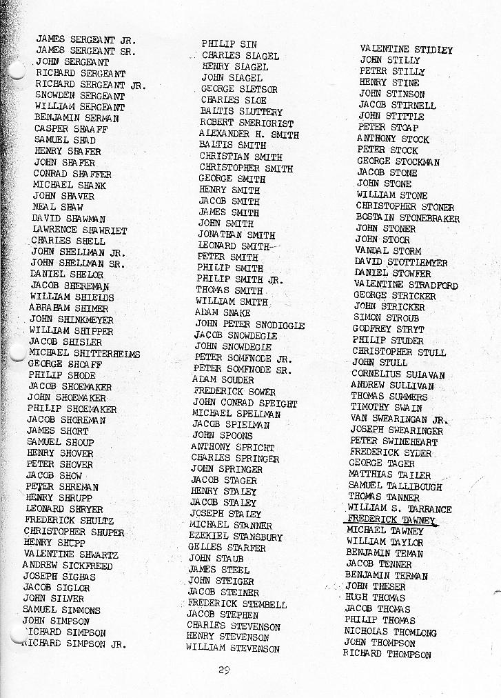 On February 5, 1777, the General Assembly of Maryland enacted a law which made it necessary to sign an Oath of Allegiance and Fidelity to the State of Maryland and the cause of Freedom during the Revolutionary War. These oaths were taken before a magistrate of the court. They included every free male 18 years and over, and all persons holding any office of trust or profit in the state. It is in this record where we find the first mention of our ancestor, Frederick Tawney. He is listed with a Michael Tawney, who was likely either Frederick's father or brother.