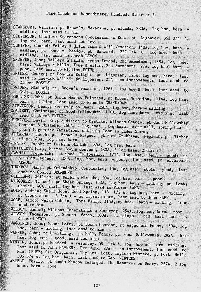 In 1798 our ancestor appears in the tax assessment list for Westminster District, Frederick County. The assessment places Frederick Tawney in District 3, "Pipe Creek and Westminster Hundred," and also tells us the name of the two parcels of land he owned. The first is called "Good Fellowship," and includes a log house and a barn, both in good condition. The second parcel of land is called "Arnold's Remnant," named after the previous owner who is identified as "Archibald Arnold." Here the condition of the log house and barn are described as "poor."