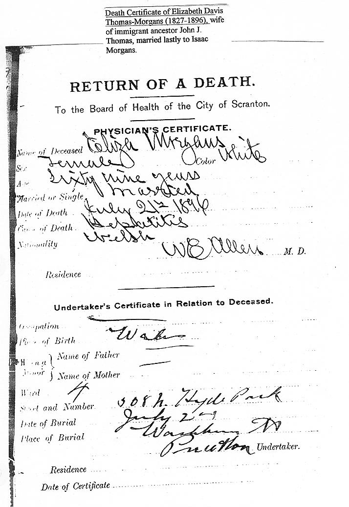 Elizabeth Morgans died at her home on 508 North Hyde Park Avenue on July 21, 1896. Her death notice was published in the Scranton Republican the following day, July 22, 1896. The obituary mentions that she was born in Brynmawr (Wales). Elizabeth's death certificate can be found at the county courthouse and the Albright Library in Scranton.
