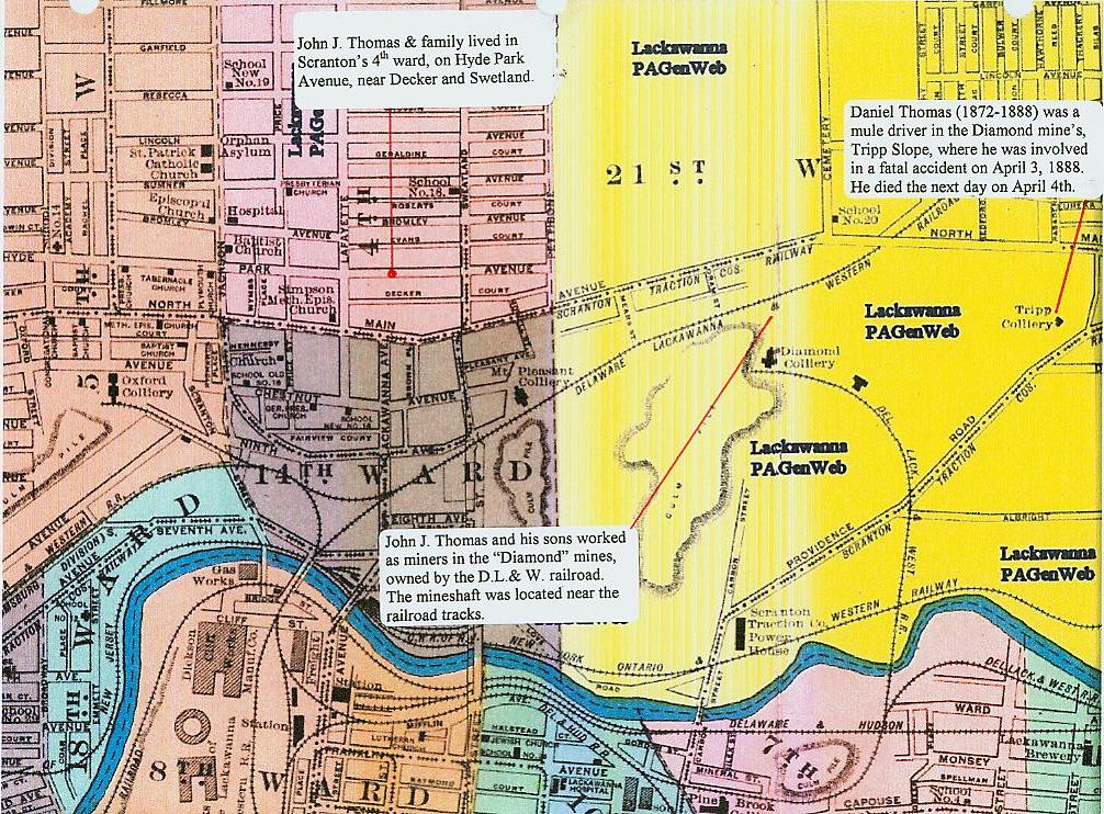 Daniel Thomas (1872-1888) was the youngest of John and Elizabeth's children. Like his brothers, he was a mule driver in Hyde Park's Diamond mines. He died on April 5, 1888, a day after suffering a fatal accident in the mines. The accident was noted in the newspaper on the day he died, and his death certificate can be found at the county courthouse and the Albright Library in Scranton.