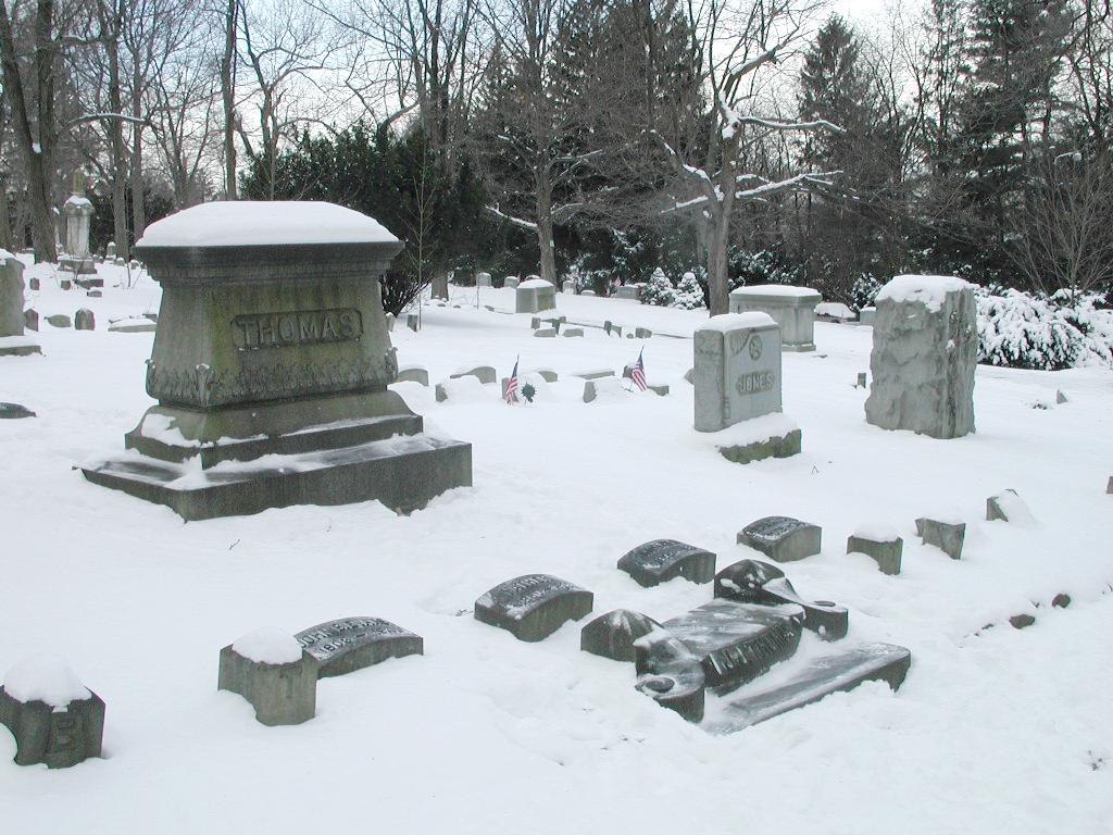 John J. Thomas, his wife Elizabeth, and their children Hannah, Daniel, David and Franklin, are buried at the Washburn Street Cemetery in Hyde Park. Son John J. Thomas, Jr. and family are buried in Forest Hill Cemetery in Dunmore, while son Hoise Thomas and his wife are buried in Abington Hills Cemetery. This page features photographs of the final resting places of John, Elizabeth, David and John Jr. (Hannah and Daniel do not have markers.)