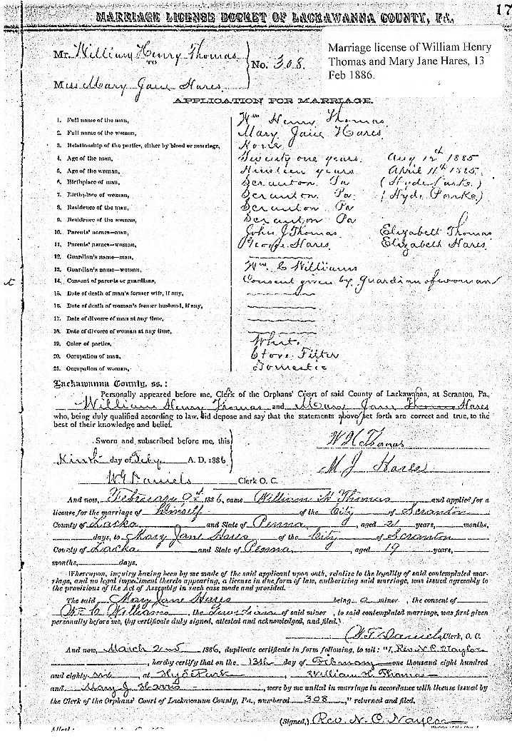 On February 13, 1886, William H. Thomas, son of John Thomas and Elizabeth Davis, married Mary Jane Hares, daughter of George Hares and Elizabeth Williams. Mary Jane's father George Hares died in early 1867, so her legal guardian, grandfather William C. Williams, had to give his consent to the marriage. On February 13, 1936, William and Mary Jane celebrated their 50th wedding anniversary at the their home on Monsey Avenue in Green Ridge.