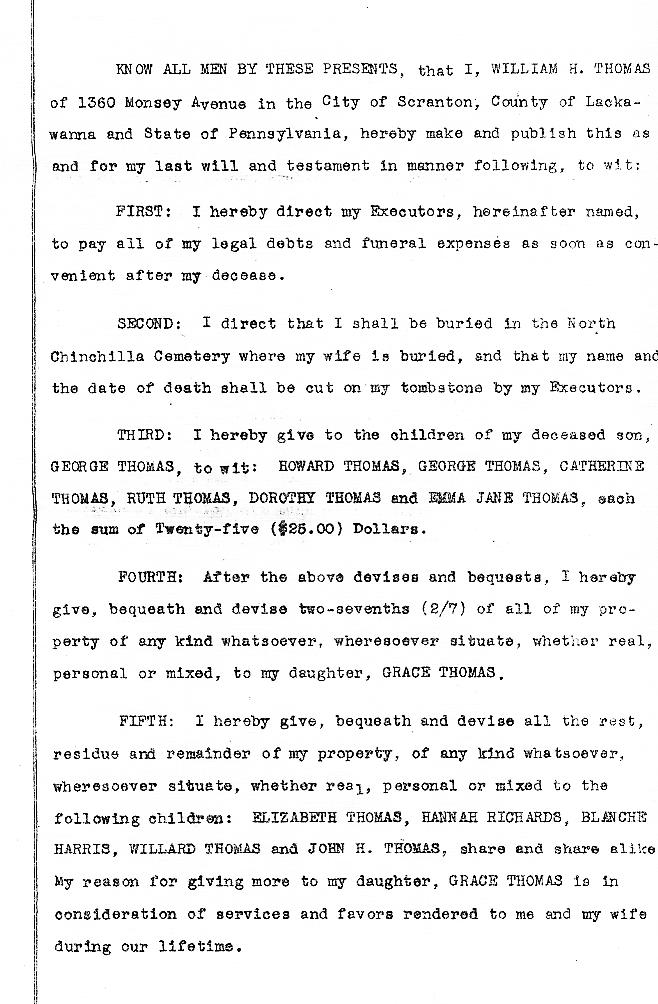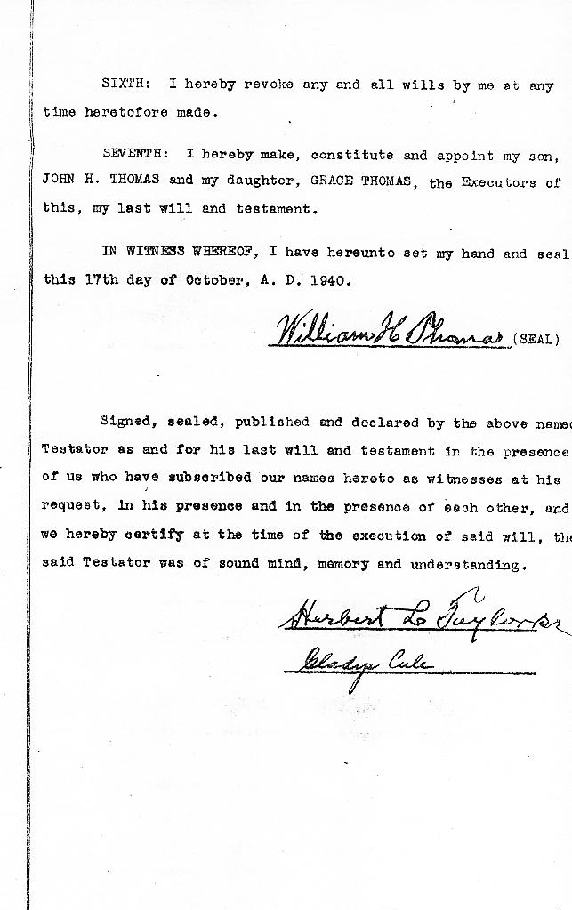 William Henry Thomas died on April 27, 1947 at the home of his daughter Grace Thomas in Washington, D.C. His will was written seven years earlier in 1940 and was filed at the Lackawanna county courthouse in Scranton. In his will William directs that all his expenses be paid, and that he be buried in the family plot in the North Chinchilla cemetery, and "that my name and date of death shall be cut on my tombstone". He leaves $25.00 each to the children of his deceased son George, and a 2/7ths share of his estate to his daughter Grace Thomas. Grace received a double share because she had spent much of her adult life caring for her mother and father in their declining years. The rest of William's estate was divided equally among his other surviving children. Lastly, William appoints his son John H. (Jack) Thomas and his daughter Grace as executors of his estate. William executed and signed the will on October 17th, 1940, giving us the only known sample of his handwriting.