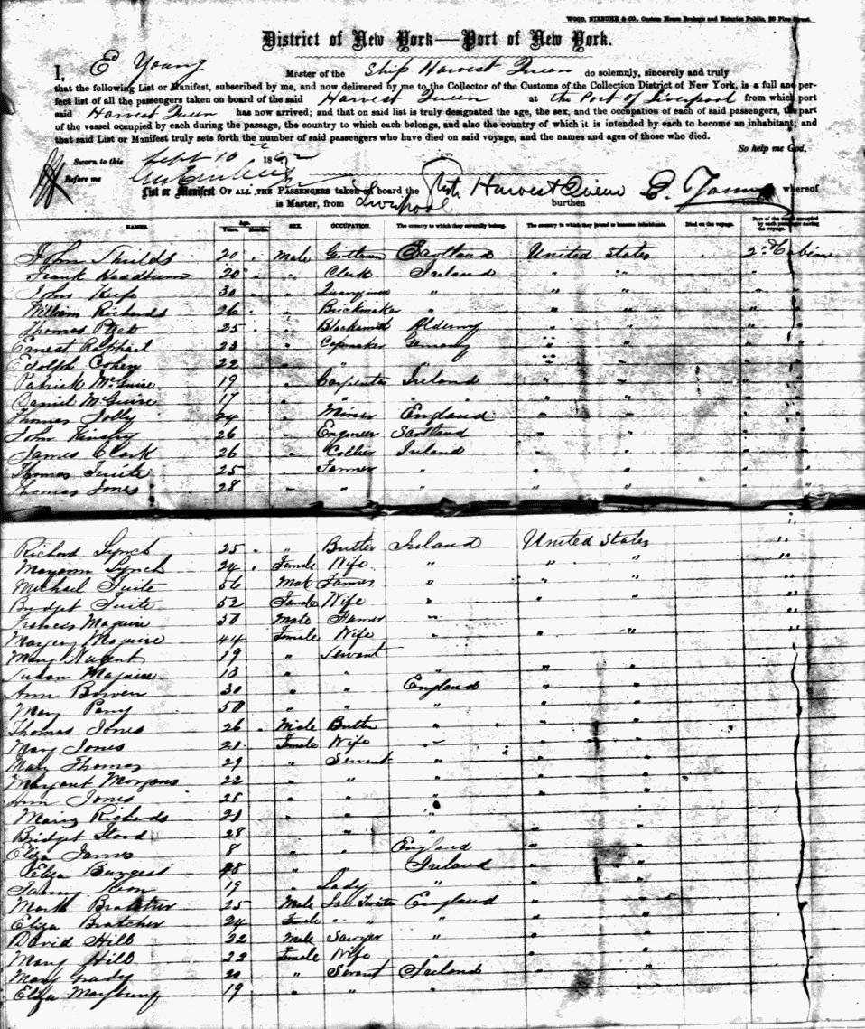 Follow this link for an image of the front page of the Harvest Queen's passenger list for the voyage that brought Thomas Morgan to America. The Harvest Queen arrived in New York on 10 Sept 1862. Thomas Morgan is listed on page 2 of the manifest as a 29-year-old collier.He proceeded at once to Scranton and for six months worked at his trade, after which he was employed in the coal mines of the Delaware, Lackawanna & Western Company, and became a practical miner. In 1879 he was appointed alderman from the fifteenth ward to fill a vacancy in that office and was commissioned by Governor Hoyt. The following year he was elected on the Republican ticket to the same office and was commissioned by the same governor. In 1875(1885?) he was re-elected and commissioned by Governor Pattison. Five years later he was again elected and was commissioned by Governor Beaver. In May, 1895, after sixteen years of service, he retired from the office, but still continues as notary and conveyancer, in connection with the life insurance business. Since 1895 he has been a tax collector.