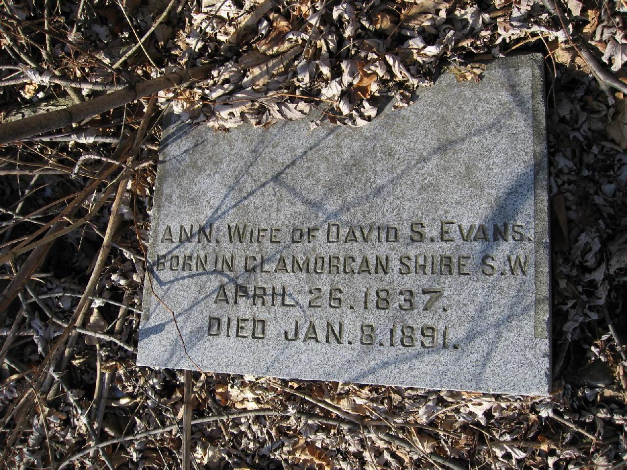 | GRIFFITH, Elizabeth | 24 April 1874 | (inscription in Welsh) Aged 32 Yrs, 1 Mo, 4 Days, wife of David D. Griffith, born Merthyr Tydvil, Monmouthshire, south Wales | |