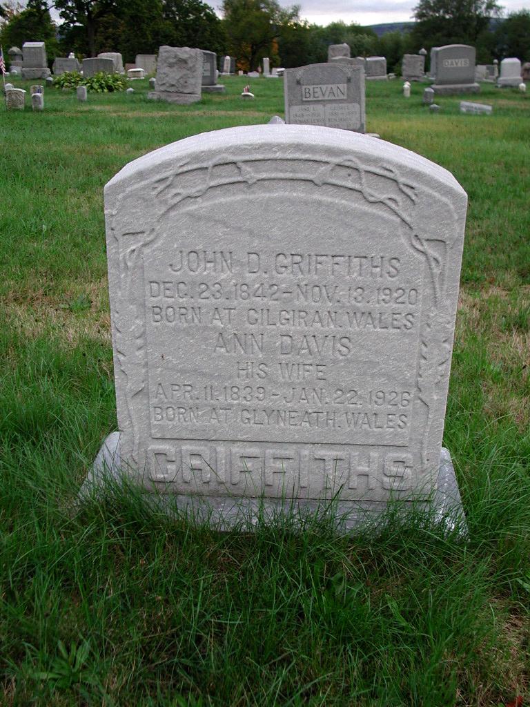 | GRIFFITHS, John D. | 23 Dec 1842 | 13 Nov 1920 | Born at Gilgiran (Gilwern, Breconshire?), Wales, husband of Ann Davis Griffiths |