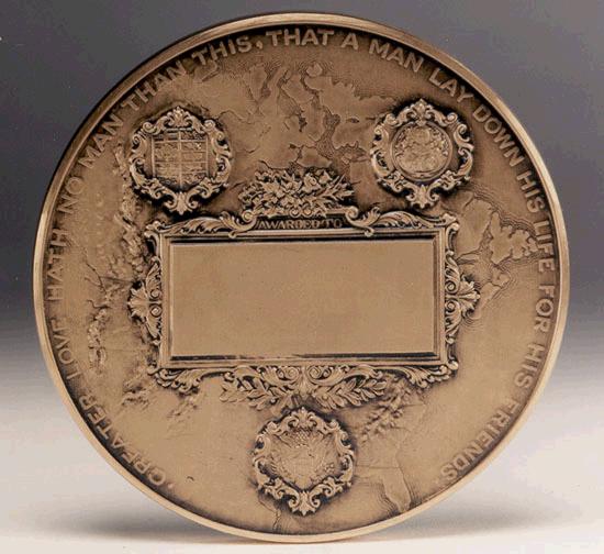Below: the front and reverse of the Carnegie Medal, awarded posthumously to Daniel Thomas in 1918. (Photographs copyright © and courtesy of the Carnegie Hero Fund Commission web site)