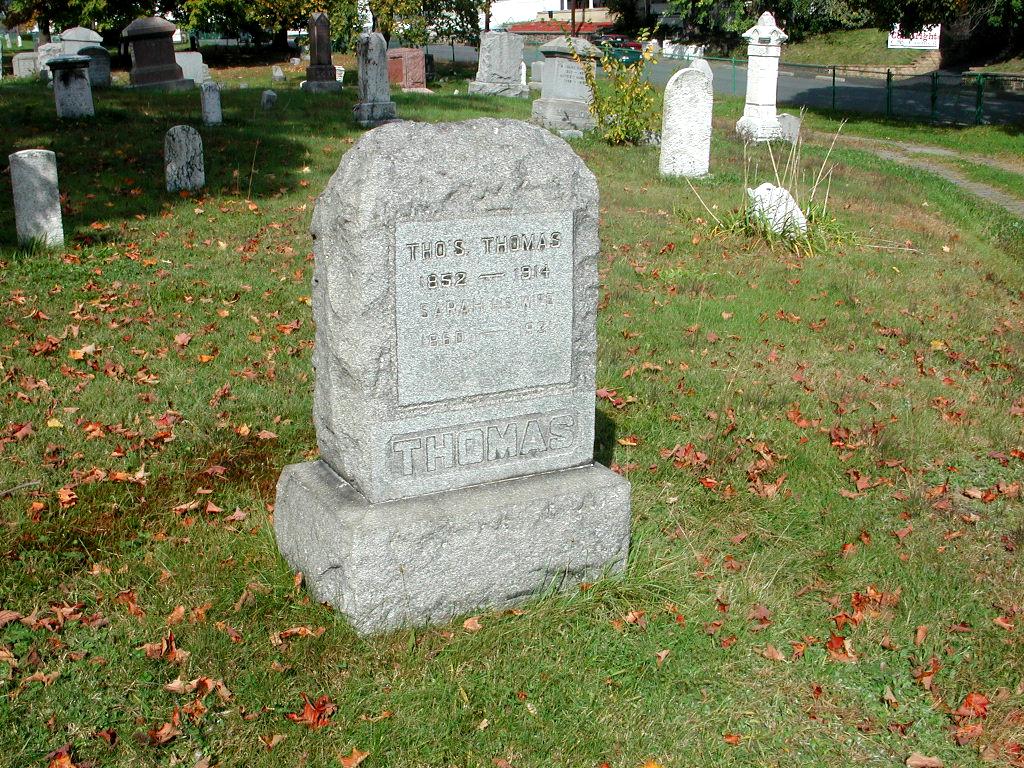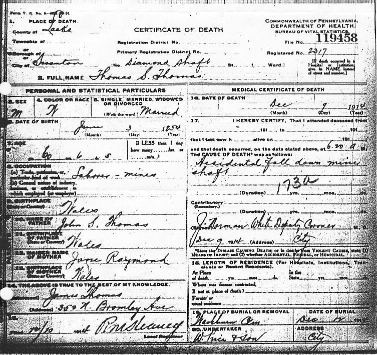 A list of the men killed in the accident is also illustrative of the transformation that took place in Scranton's mining industry, beginning in the late 19th century. By then, most of the sons of Welsh miners had stopped following their fathers into the mines, their numbers being replaced, in large part, by immigrants from eastern Europe. By 1914, the Welsh, who once virtually controlled the mines of Scranton, had become a minority in their former occupation. Of the thirteen men killed in the Diamond Mine accident, only one, Thomas S. Thomas, was of British descent; all the others were of eastern European or Slavic origin. Thomas Thomas was buried in the Washburn Street cemetery in Hyde Park, and I have included a photograph of his grave and a scan of his death certificate.